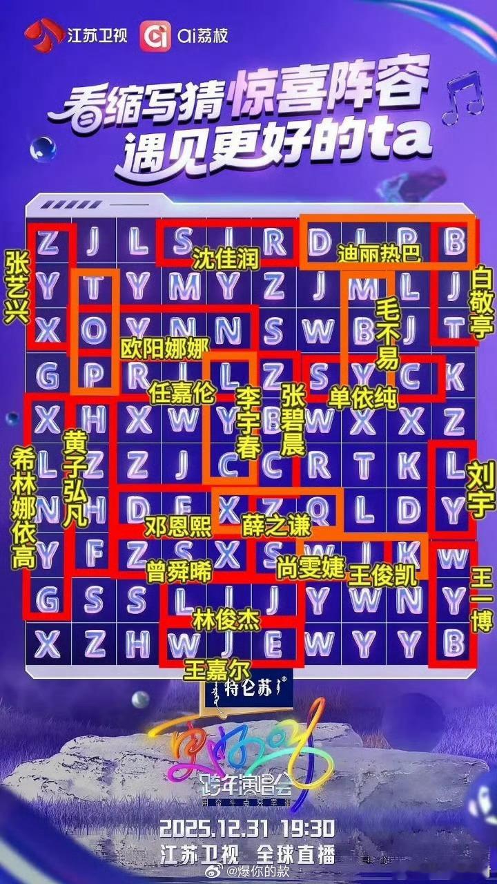 江苏卫视跨年你还我脑子 谁懂啊,打开江苏卫视跨年就被缩写题难住了,MBY想了半天都没反应过来是毛不易,还是我妹提醒我才猜对,后面看到他唱歌的样子,温柔又有力量,瞬间觉得就算“做题”也没关系,好听的歌值得等待江苏卫视跨年