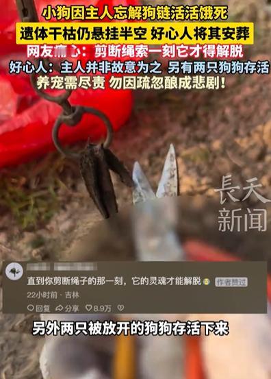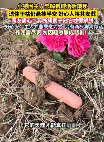 湖南一小狗因主人忘解狗链,被活活饿死,遗体干枯仍悬挂半空 ,好心人发现后将其安葬,好心人称,主人回老家一个月多了,可能是忘记解开一只狗狗的铁链,并非故意为之,因为另有两只狗狗解开存活,其中一只还生下了幼崽,目前由好心人照料。网友痛心:剪断绳索一刻,它才得解脱! 原来,主人家有3条狗,走的时候着急,他解开了两只狗的绳子,让它们能在院子里自己找吃的、喝井水,偏偏把拴在院角柱子上的小狗给忘了。那铁链子短得很,只能让小狗在半米范围内转圈圈,井水、狗粮盆都够不着,相当于把它困在了 “绝境” 里。 这一个多月里,小狗从一开始饿了叫、渴了扒地,到后来没力气挣扎,最后慢慢断了气,全程没人管。好心人路过时,远远看见院角挂着个 “东西”,走近一看,吓得后退半步 —— 是那只小狗,身体干得像块柴,脖子上的铁链勒出一道深深的印子,眼睛闭着,早就没了气息。 好心人心里疼得慌,赶紧找来钳子剪断铁链,小心翼翼把小狗抱下来,在附近找了块有草的地方,挖了个坑给埋了,还在土上面剥了一根火腿肠,也算是仁至义尽了。 有网友表示:“一句‘忘了’就害一条命!既然拴着它,就该想到它没的吃,养宠不负责比坏还残忍。 难以想象,小狗挂在铁链上饿死,它最后得有多绝望? 俗话说 “养犬不教,主之过;养宠不护,等于害”,养宠物从来不是 “领回家就完事”,而是要扛一辈子的责任。主人明明知道小狗拴着走不开,却没做任何安排 —— 既没托付给邻居照看,也没给它准备足够的食物和水,甚至没多检查一遍,这种 “无心之失”,本质是对生命的漠视。 很多人觉得 “宠物能自己扛”,尤其是拴养的狗,觉得它们耐饿、耐渴,其实不然。小狗的肠胃和人类不一样,饿两三天就会脱水、器官衰竭,更别说被拴着没的选。 对小狗来说,不管主人是故意还是疏忽,结果都是一样的:失去生命。愿每一只宠物都能被温柔以待,每一位养宠人都能不负这份沉甸甸的信任。 小狗因主人忘解狗链活活饿死