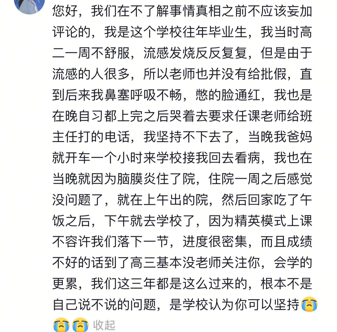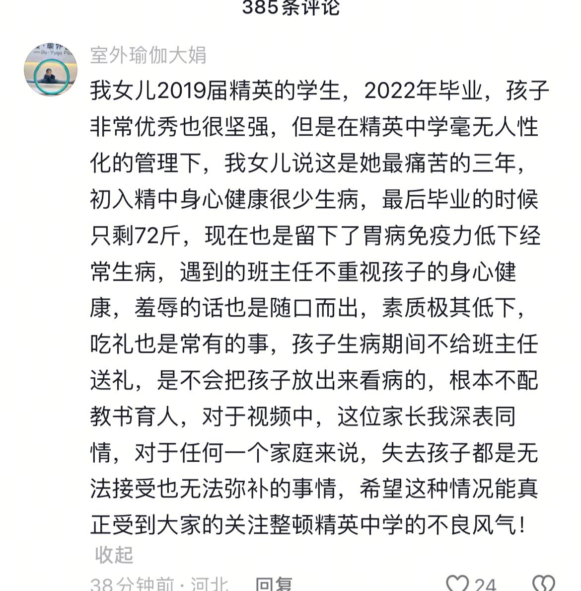 石家庄精英中学学生在校去逝,到底是谁的错?! 下午,和朋友聊天聊到学区房,朋友劝别把学校看得太重,学校的严格管理有时候也不一定是好事儿,问我听没听说这两天在网上闹得沸沸扬扬的精英中学学生在校死亡的事情,我赶忙去网上搜寻相关消息,很快找到了微信群内家长的发言的截图。 截图中应该是去逝孩子家长发出的求助信息,希望自己孩子在校去逝的事情引起人们的足够关注,从截图中的信息可以看出事情的大致经过: 她的孩子今年9月份刚刚入学精英中学,前不久,由于身体不舒服便向学校请假,学校坚持学生跑操,没多久就发生了人们都不愿意看到的悲剧! 石家庄精英中学可是省内名校,多少人想挤破脑袋让自己的孩子进入名校就读,精英中学也确实对学生要求严格,相信学校在孩子不舒服需要请假的情况下坚持让孩子跑操,肯定也是让孩子提前为中考体育做准备,取得一个好成绩,没想到悲剧就发生了。 家长想让孩子上好学校,无非就是因为好学校管理严格,现在学校严格的管理,导致了悲剧的发生,听起来我实在是让人感到特别无奈!卷来卷去,受伤的还是孩子! 我专门在网上了解到一些关于精英中学管理严格的网友留言,从网友的表述中可以看到,精英中学这么多年来取得的成绩,还真不是偶然和意外,管理是真严格!不过,这种管理模式真的不一定适用所有的孩子。 建议家长们在决定选择精英中学这样的学校之前,一定要结合孩子的自身情况,首先评估一下孩子到底能不能承受得住;其次,要想清楚到底值不值得,为了一个中考,让孩子去受那份苦,透支孩子的潜力,于心何忍? 最后,也真诚的希望各所中学能够以此为戒,管理更加人性化一些,孩子的身体健康无小事,不要靠着牺牲孩子的身体,换取一时的成绩。学生不幸身亡 学生猝死 中学生的死亡