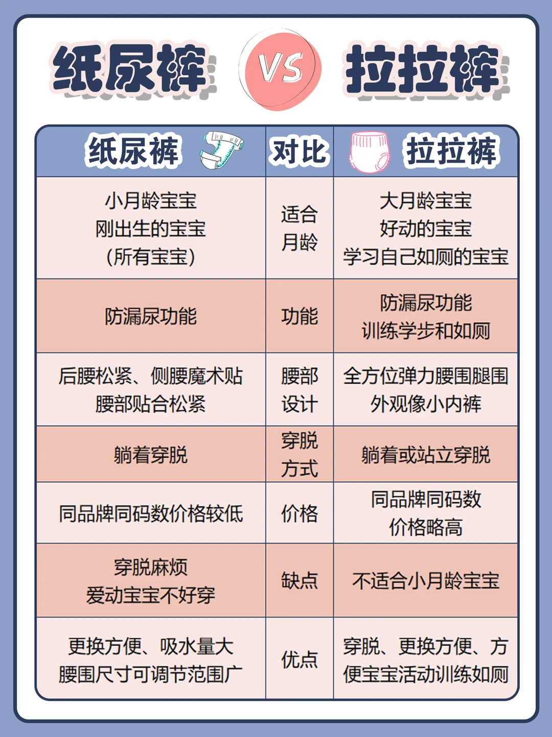 纸尿裤适合年龄小,活动能力比较局限的宝宝,拉拉裤适合6个月以上的宝宝,也可以在使用M号或者L号纸尿裤的时候搭配使用