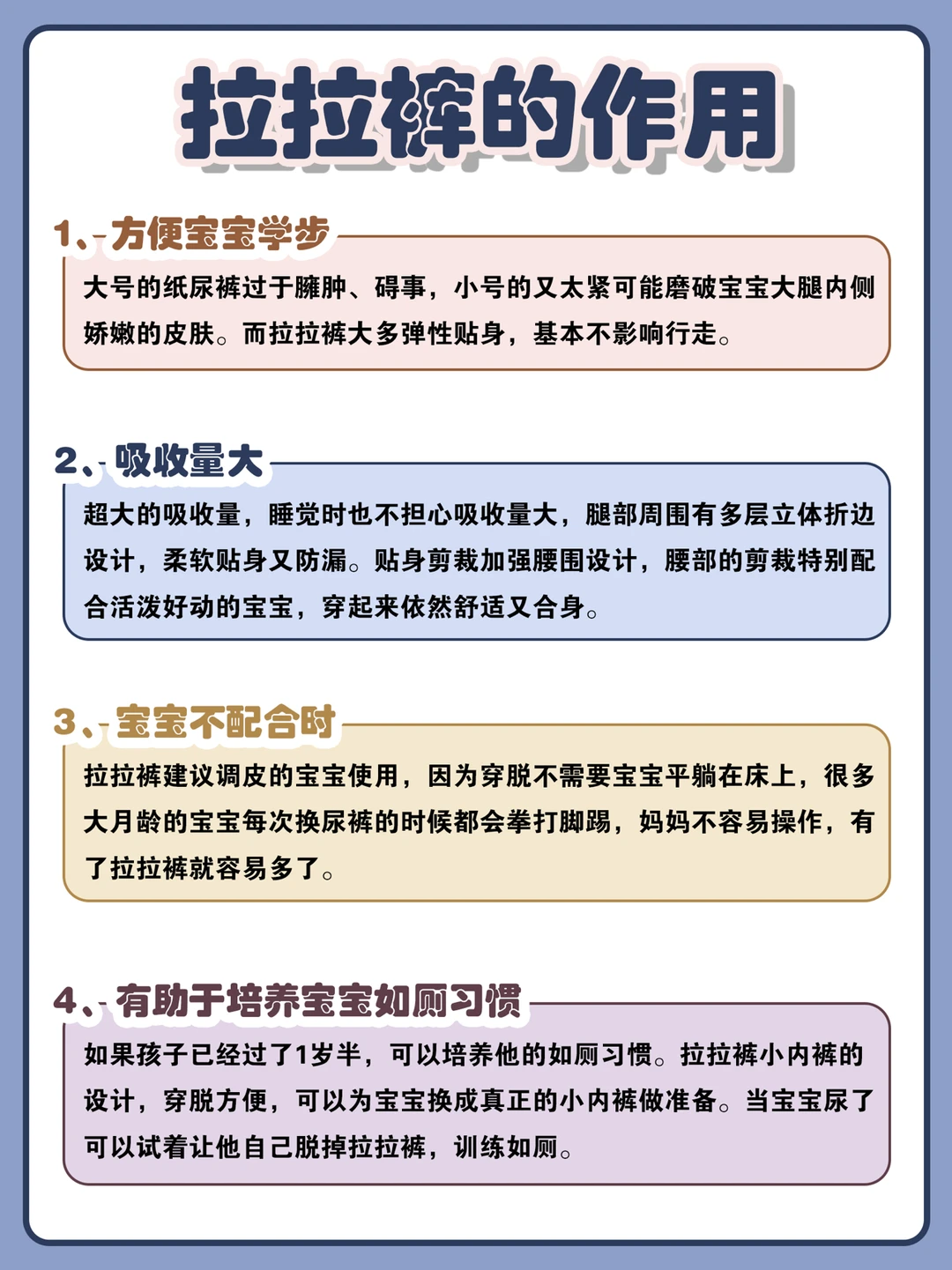等宝宝稍大点后,宝宝好动,纸尿裤穿脱就比较心累。拉拉裤穿脱会更方便一些,站着也能换,而且比较牢固,不担心宝宝自己扯开它