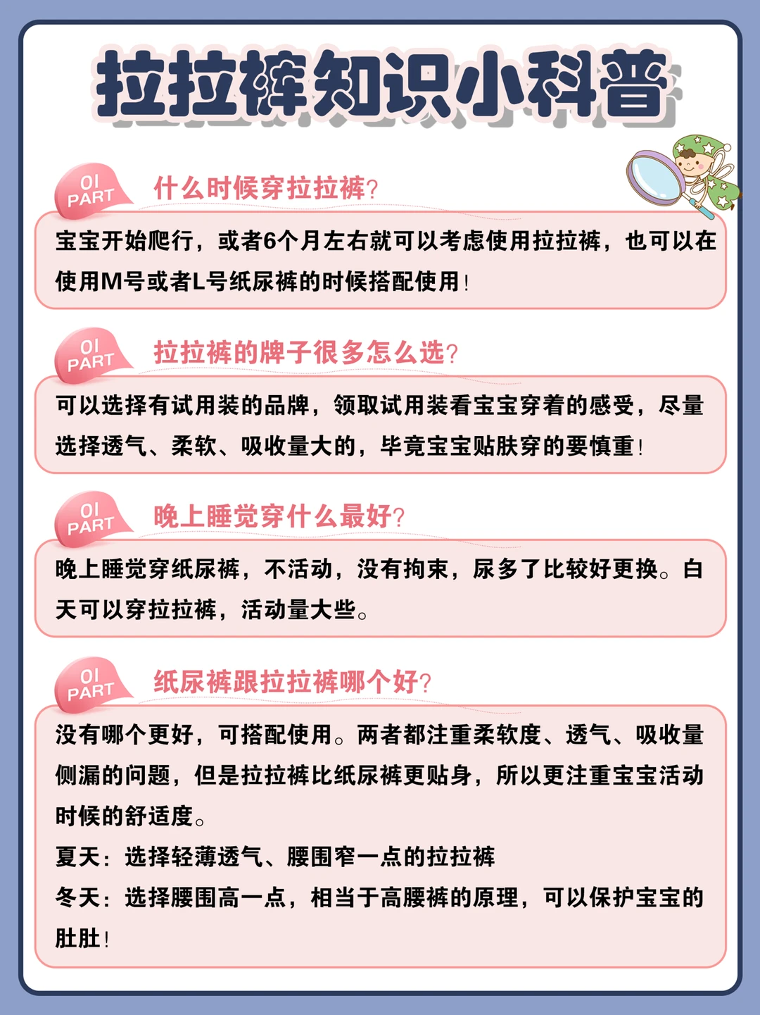 晚上睡觉穿纸尿裤,不活动,没有拘束,尿多了比较好更换。白天活动量大些,🉑️以穿拉拉裤
