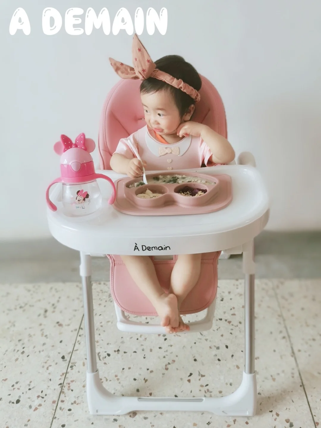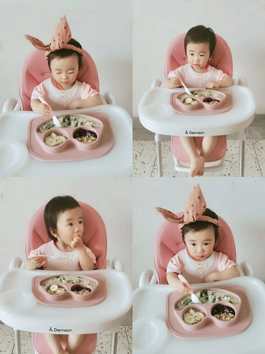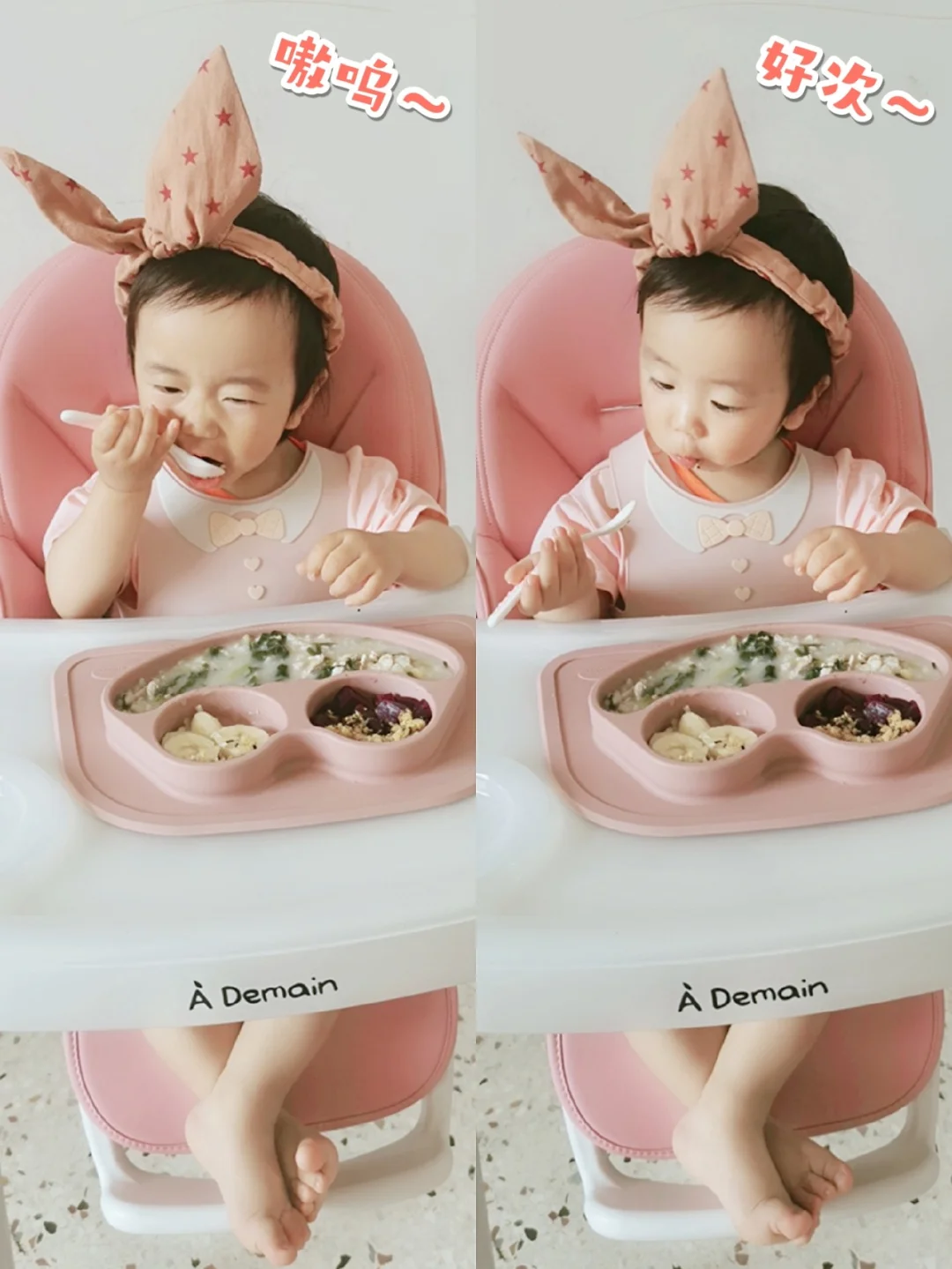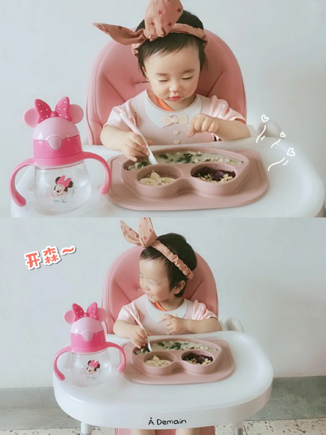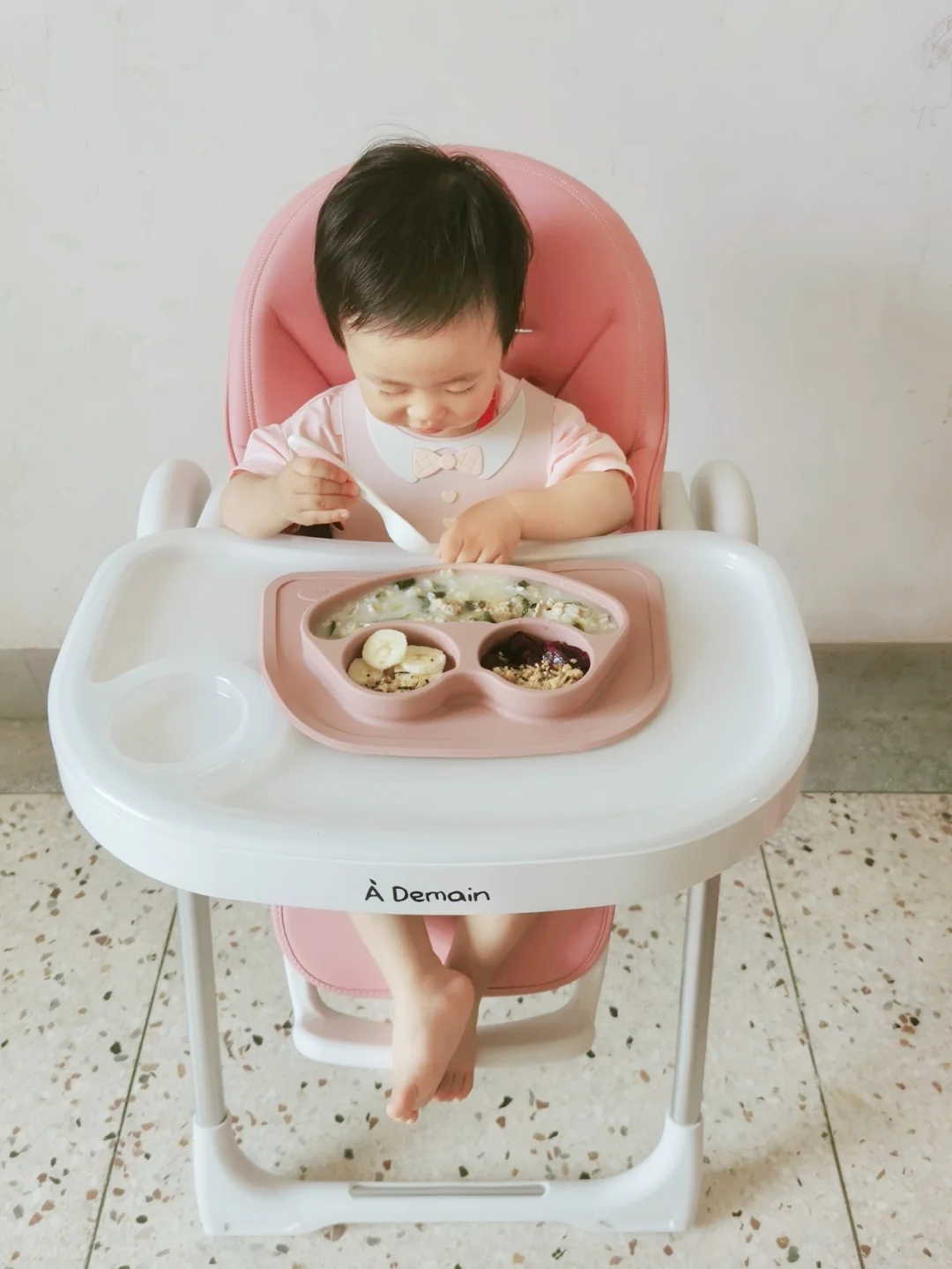 之前没有餐椅在推车上喂饭,宝宝动不动就想自己站起来太危险了😢有了餐椅,宝宝学着自己吃饭,不仅培养了良好的用餐习惯,她自己也更有成就感,hin开心😁😁