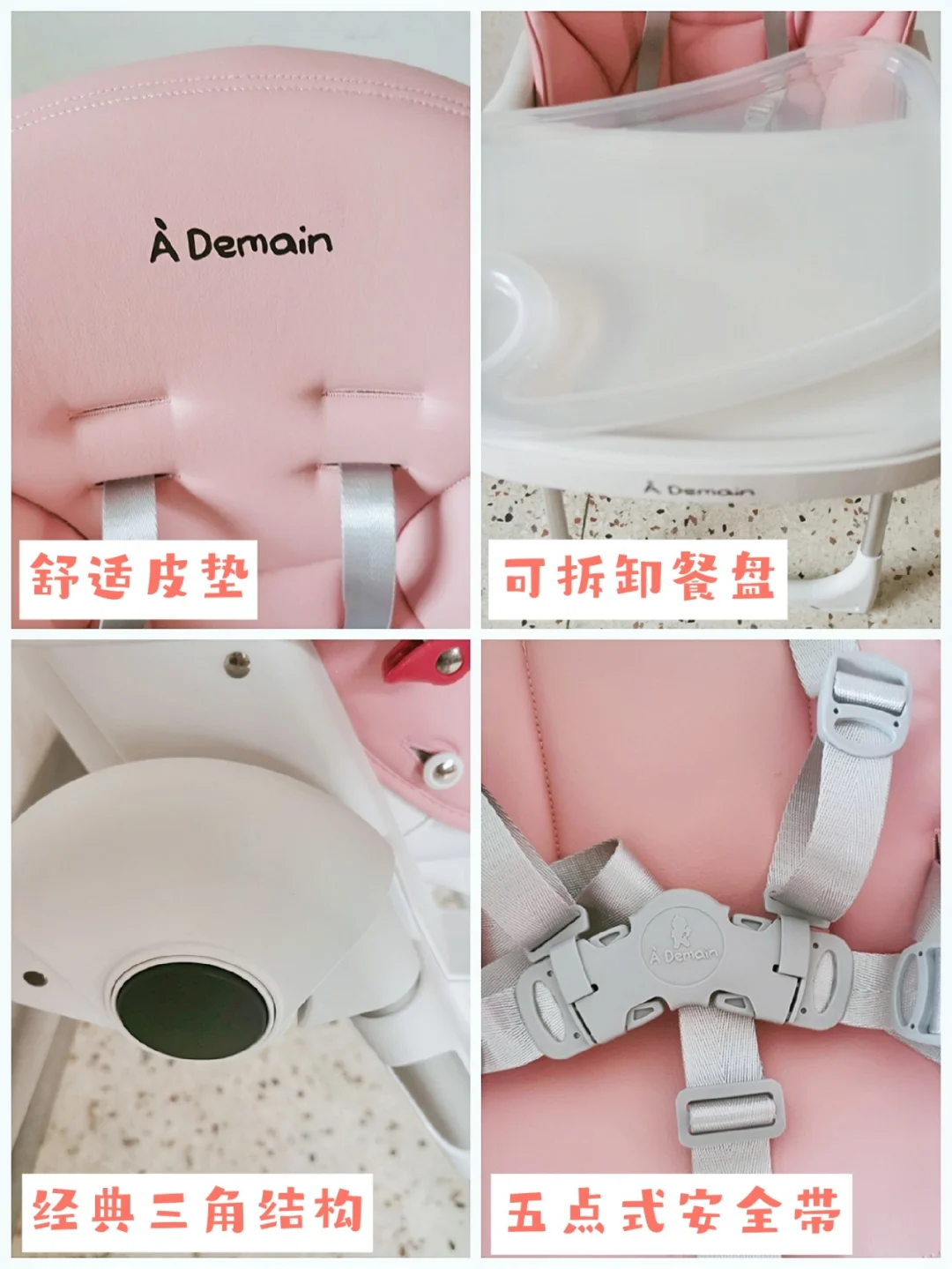 整个椅身非常有质感,皮垫防水防油污容易打理,高度6档调节,拖腿3档调节,靠背5档调节,让宝宝坐着舒适躺着舒心✌T型把手、防滑落柱、五点式安全带给宝宝坠好的防护~经典三角结构更稳定,不用担心宝宝有掉落风险!而且0-5岁都可以用,性价比max✅