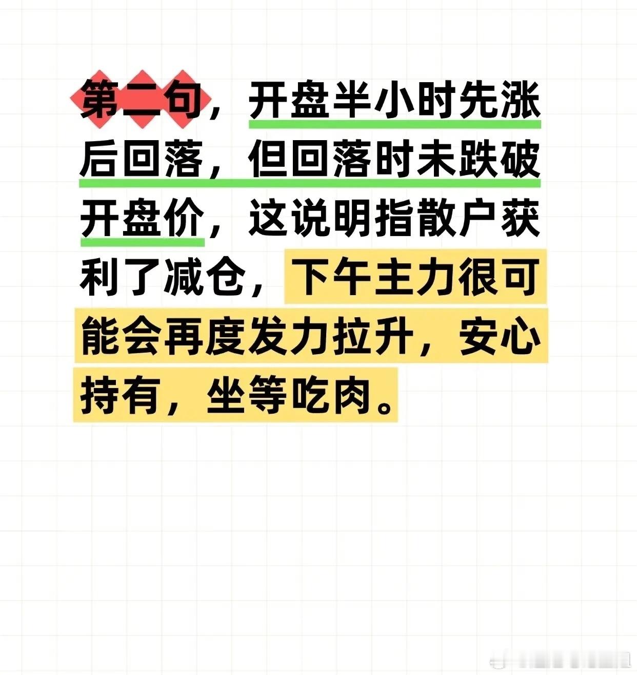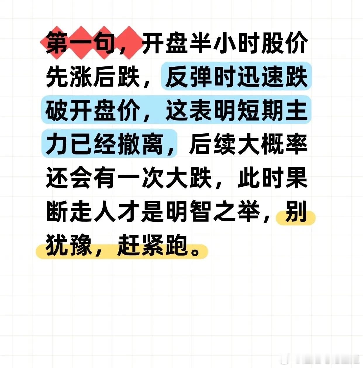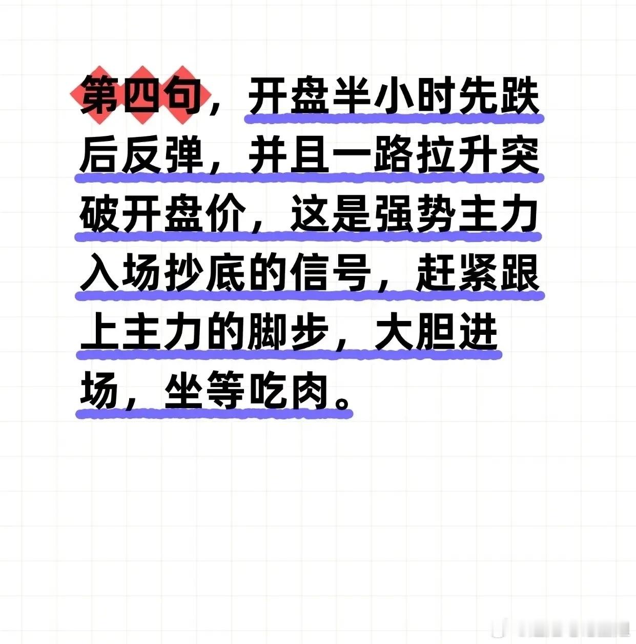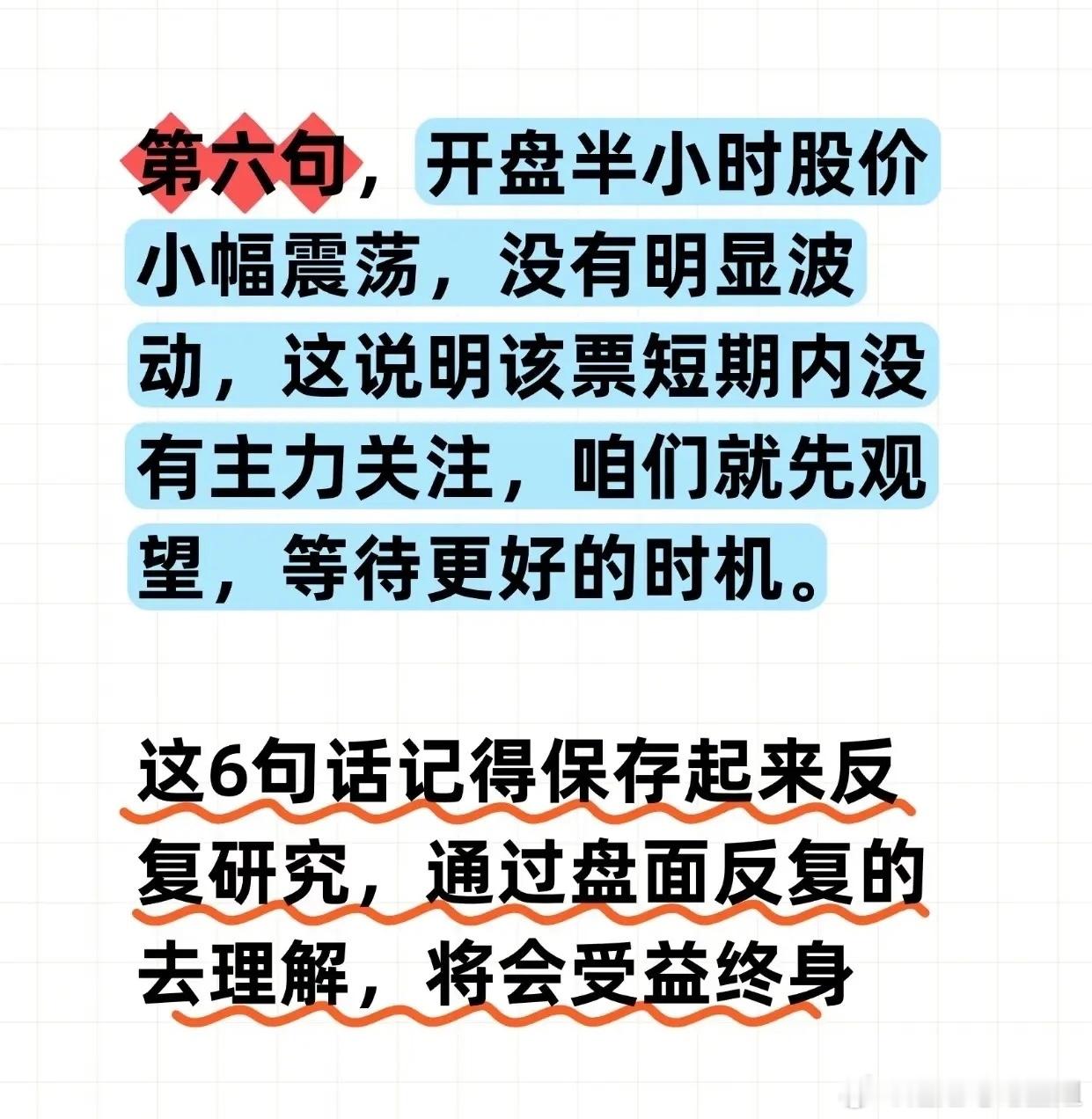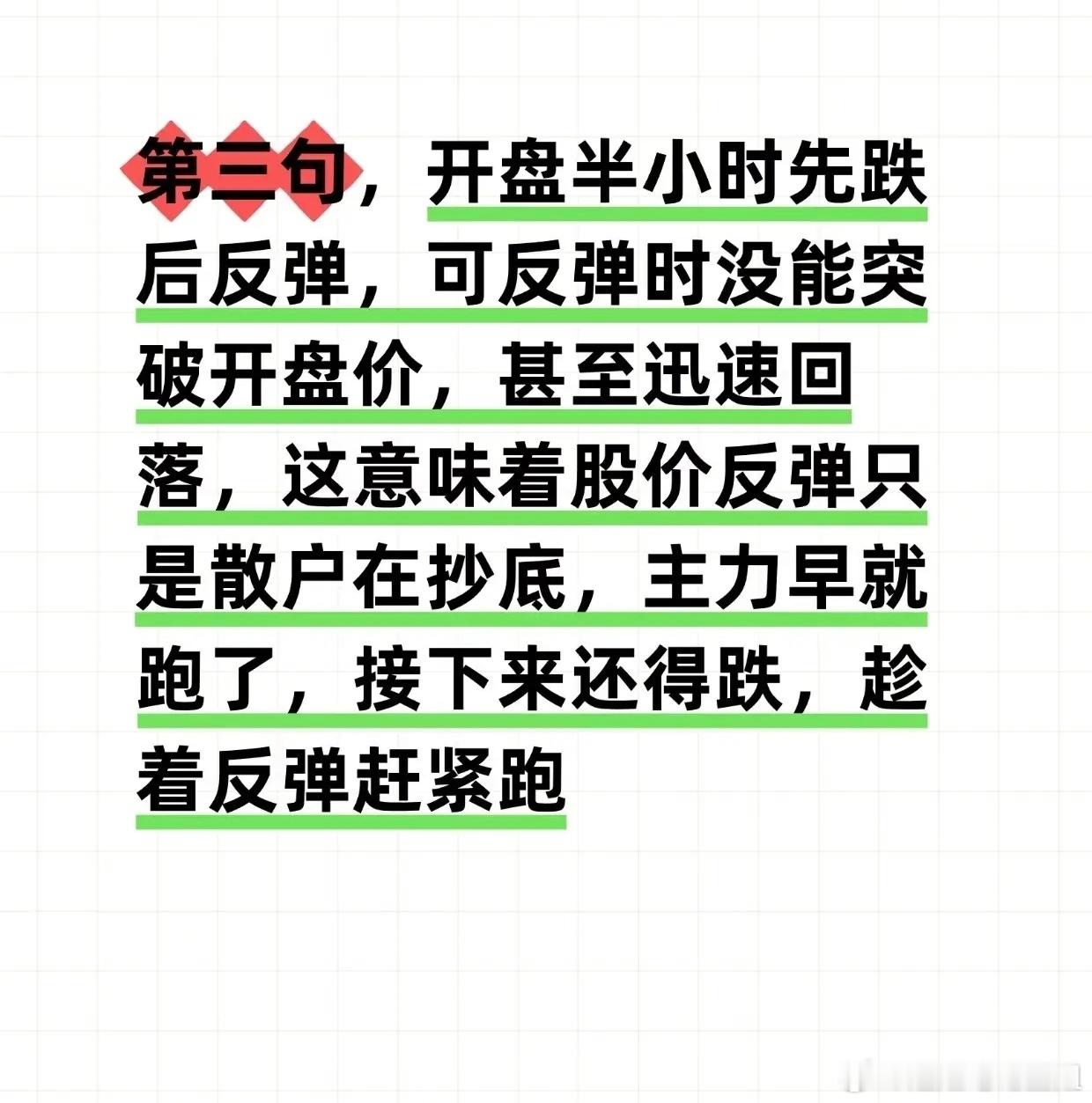 “通过开盘后30分钟股价走势判断当日涨跌”的股市短线操作方法,具体如下:“第一句”:若开盘半小时股价先涨后跌,且反弹时迅速跌破开盘价,说明短期主力撤离,后续大概率再跌,需“果断走人”“别犹豫,赶紧跑”。“第二句”:若开盘半小时先涨后回落但未跌破开盘价,意味着散户获利减仓,下午主力可能发力拉升,建议“安心持有,坐等吃肉”。“第三句”:若开盘半小时先跌后反弹,但反弹未突破开盘价甚至迅速回落,说明反弹是散户抄底、主力已跑,后续仍会下跌,需“趁着反弹赶紧跑”。“第四句”:若开盘半小时先跌后反弹且一路拉升突破开盘价,是强势主力入场抄底信号,应“跟上主力脚步,大胆进场,坐等吃肉”。“第六句”:若开盘半小时股价小幅震荡无明显波动,说明短期无主力关注,需“先观望,等待更好时机”;。