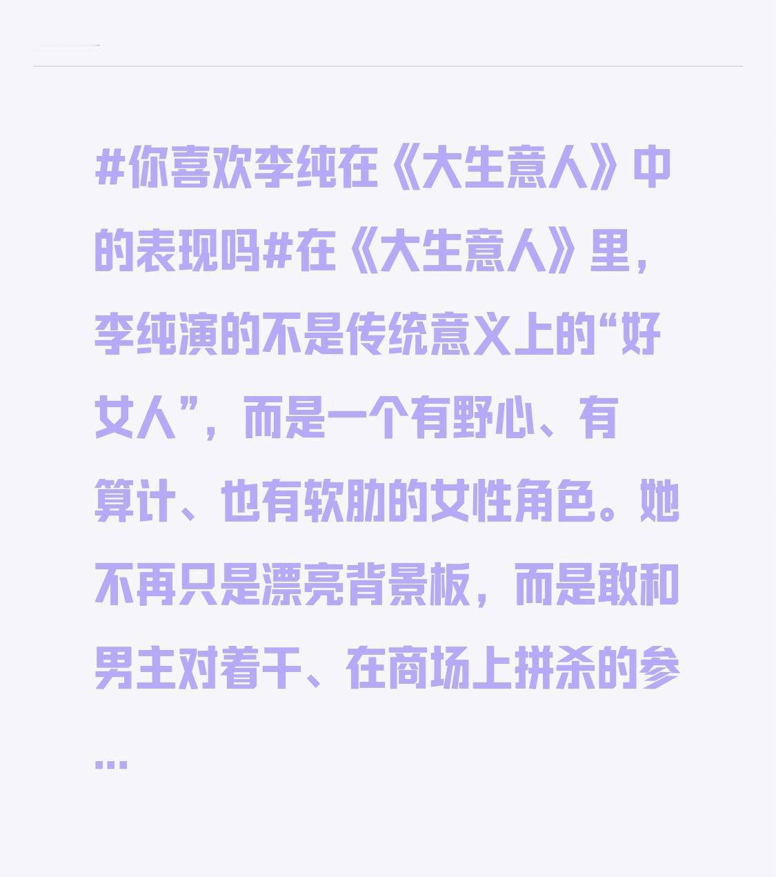 李纯把“坏女人”这个词,彻底演废了。 她在《大生意人》里,不是演一个反派。 她演的是一个把野心穿成铠甲,把算计磨成刀刃,然后在男人堆的牌桌上从容下注的女人。 观众吵翻了,因为她的角色撕掉了所有关于“好女人”的温柔伪装。 最新的那场对决戏,她的眼神在狠戾与脆弱间切换,只用了三秒。 这不是表演,这是手术刀式的心理博弈。 专业剧评人为这段戏鼓掌,她凭此杀入“最具突破性角色”榜单前三。 业内开始重新讨论:为什么一个“亦正亦邪”的女人,比一个纯粹的好人更具冲击力? 因为她在逼迫屏幕前的每个人,审视自己心中那片被规则压抑的灰色地带。 这不再是关于善恶的判断题,而是一面映照我们自身欲望与挣扎的镜子。