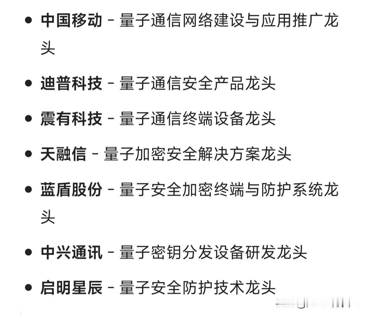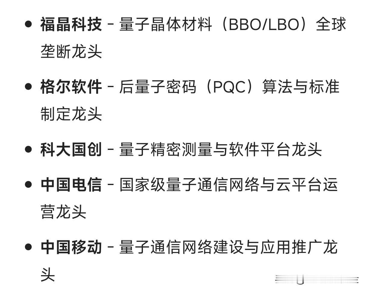 量子科技概念龙头汇总 国盾量子 - 量子通信设备与量子计算整机龙头 光库科技 - 量子核心光电器件龙头 神州信息 - 金融量子安全解决方案龙头 亨通光电 - 量子光缆与通信基础设施龙头 中科曙光 - 量子-经典混合计算服务器龙头 华工科技 - 量子点激光器芯片全球独家龙头 中国长城 - 量子计算技术研发与离子阱路线龙头 福晶科技 - 量子晶体材料(BBO/LBO)全球垄断龙头 格尔软件 - 后量子密码(PQC)算法与标准制定龙头 科大国创 - 量子精密测量与软件平台龙头 中国电信 - 国家级量子通信网络与云平台运营龙头 中国移动 - 量子通信网络建设与应用推广龙头 迪普科技 - 量子通信安全产品龙头 震有科技 - 量子通信终端设备龙头 天融信 - 量子加密安全解决方案龙头 蓝盾股份 - 量子安全加密终端与防护系统龙头 中兴通讯 - 量子密钥分发设备研发龙头 启明星辰 - 量子安全防护技术龙头