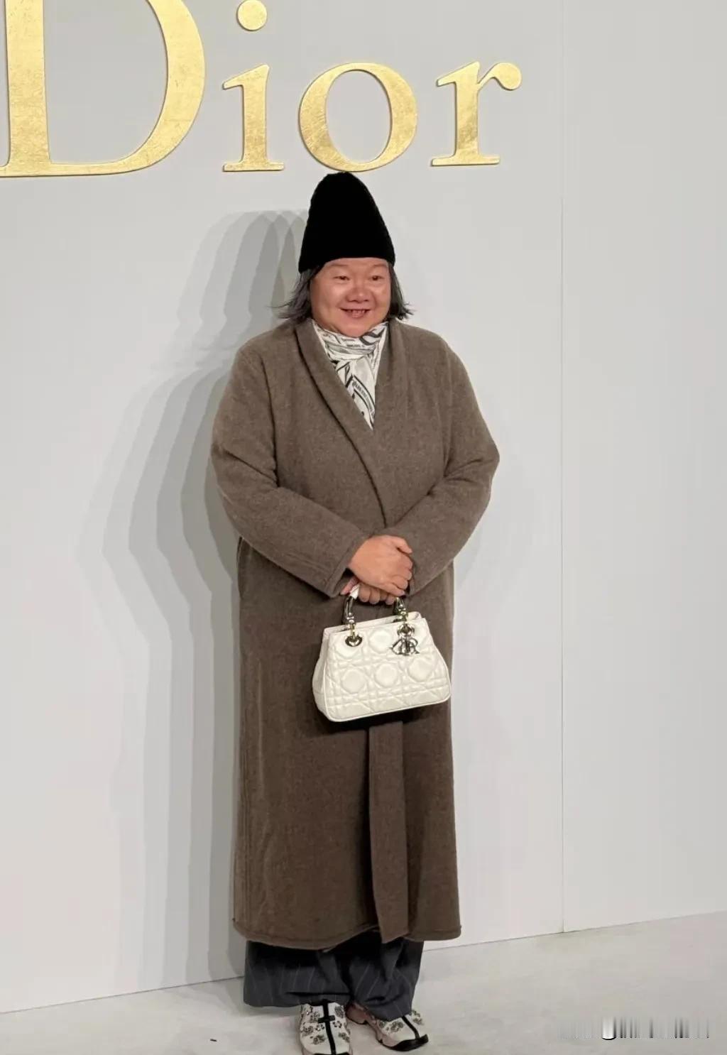 迪奥的活动台上,洪晃的造型太可爱了! 别的女星和名媛都袒胸露乳,大开叉,烈焰红唇,妆容精致,把自己最性感的一面展现出来,而洪晃就像刚起床随便洗了一把脸,什么水乳精华海蓝之谜都省略了。 戴了一顶尖尖的黑帽,一条围巾为脖子保暖,青果领的大衣把自己裹得严严实实,白色的奢侈品手提包,头上俏皮,身上端庄,脚上休闲,一个人三种分格。 活脱脱的西方花园精灵。