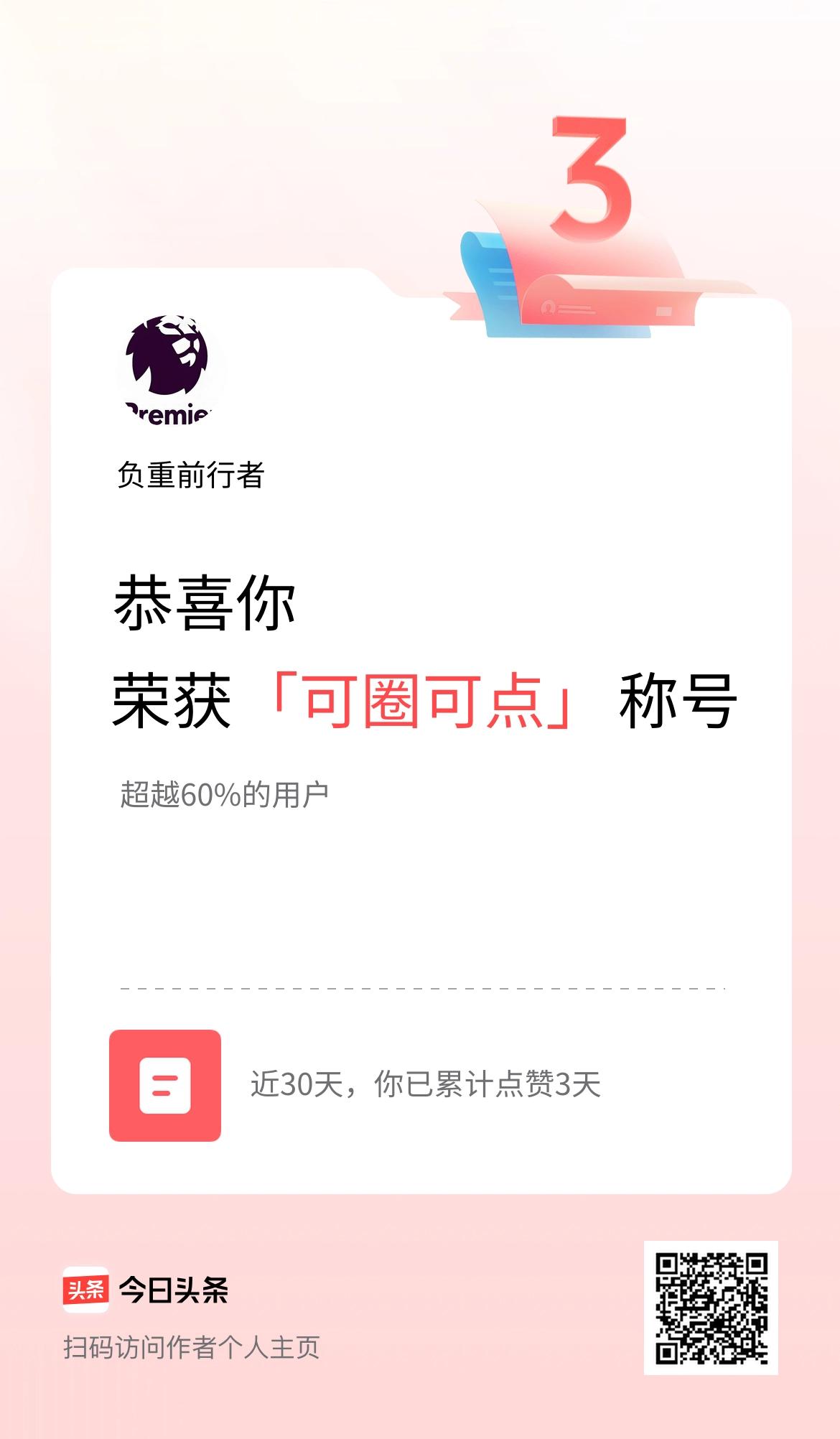 我在头条30天内点赞打卡3天,获得“可圈可点”称号