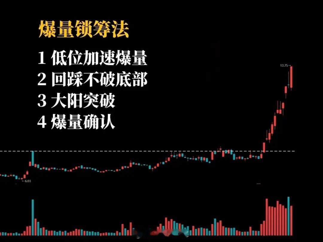爆量锁筹法是短线趋势交易中判断主力是否控盘、筹码是否稳定的模型化战法,核心是爆量换手后能缩量稳住筹码,再放量突破,多在低位波段启动时用。 爆量:关键位如平台、压力位,放出近期天量,通常为前5日均量2-4倍,分歧充分换手,筹码完成集中。锁筹:爆量后缩量回踩,股价不跌破爆量K线低点、5/10日均线等关键支撑,分时承接强,说明筹码被锁定。 确认:缩量回踩后出大阳/涨停再次放量突破,量能不低于前爆量,形成“爆量-锁筹-再突破”的闭环爆量换手分歧现,缩量回踩锁筹见;大阳突破量跟上,短线趋势要走强。股票