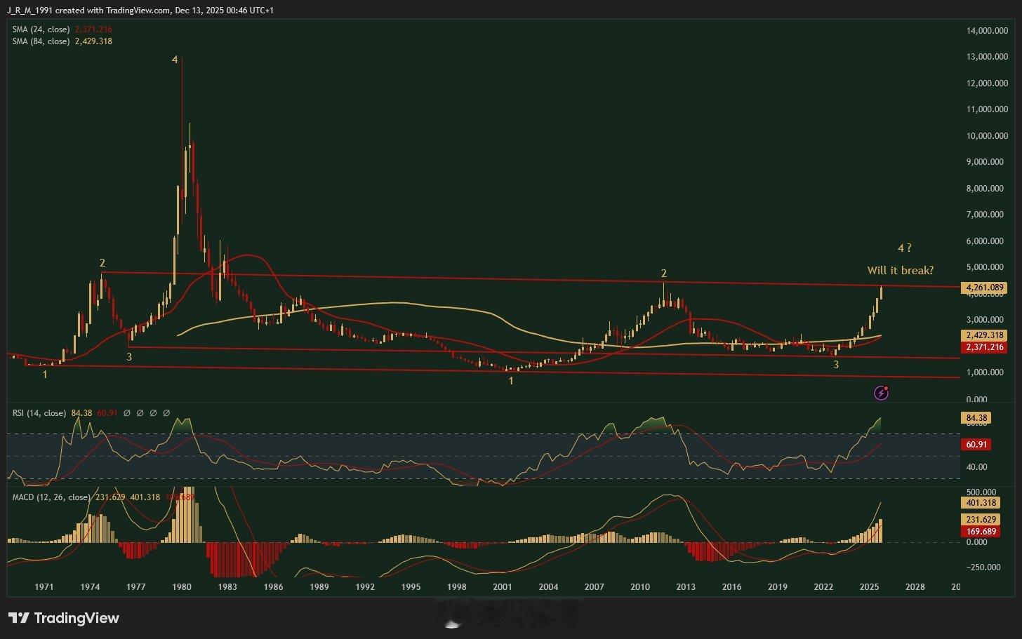 黄金价格再次逼近新高。 ①在我看来,美联储已经正式陷入困境,采取极度鸽派立场实际上已不可避免。 黄金价格试探历史新高,基本证实了美联储陷入极度鸽派的困境。鲍威尔一方面承认劳动力市场疲软,另一方面又通过隐性量化宽松政策扩大资产负债表。实际上,对通胀敏感的资产定价反映了未来六到十二个月失业率飙升的预期。坦白说,这种鸽派立场的必然性支撑了贵金属价格上涨的趋势。②鲍威尔公开承认劳动力市场疲软, 否决了任何加息的可能性,继续推进降息,并宣布扩大资产负债表——尽管考虑到购买的结构, 我们应该称之为“非量化宽松”,以显得更成熟。 ③在我看来, 利率市场低估了特朗普明年重塑美联储并推动大幅降息的决心——尤其是在未来 6-12 个月内失业率急剧上升的情况下,我认为这种情况极有可能发生。 ④有财经人士自信地宣称通胀将会下降, 而对通胀敏感的资产却明显发出相反的信号, 这同样引人注目。 ⑤我仍然非常关注美国经济进一步陷入滞胀的可能性。 尽管存在这些巨大的宏观扭曲,但我的核心观 点仍然不变。⑥当各国央行被迫采取极度鸽派政策,而通货膨胀和宏观经济扭曲持续存在时,黄金甚至比特币等硬资产就成为重要的对冲工具。⑦与高通胀和通胀上升密切相关的市场板块预示着未来物价水平将进一步上涨。随着量化宽松政策的回归,贵金属价格将迎来巨大的利好。⑧这不仅仅是另一个顶部,而是白银(M 2 调整后)在 20 世纪 70 年代才突破的一个关键水平。 如果美元汇率突破这一水平(考虑到美元贬值的可能性,这是我的基本假设),黄金和其他大宗商品价格可能会大幅上涨。⑨解决办法是恢复金本位制。但这几乎不可能。一盎司黄金的价格肯定会超过1万美元。想想看,如果我们恢复类似金本位制的制度,一盎司黄金的价值会定在多少呢?贵金属贵金属白银资产管理老常政经常涤非观点常涤非超话