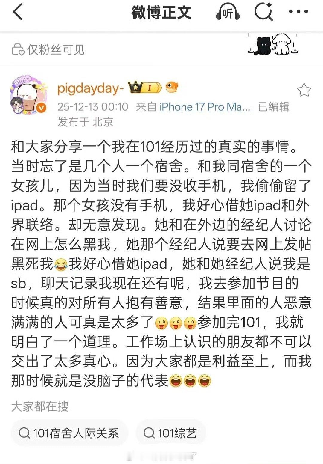 朱天天爆料创造101的🍉自己的ipad好心借给一个女生用,结果女生和经纪人商量怎么黑她,还骂她是SB。当时谁和朱天天一个宿舍啊?