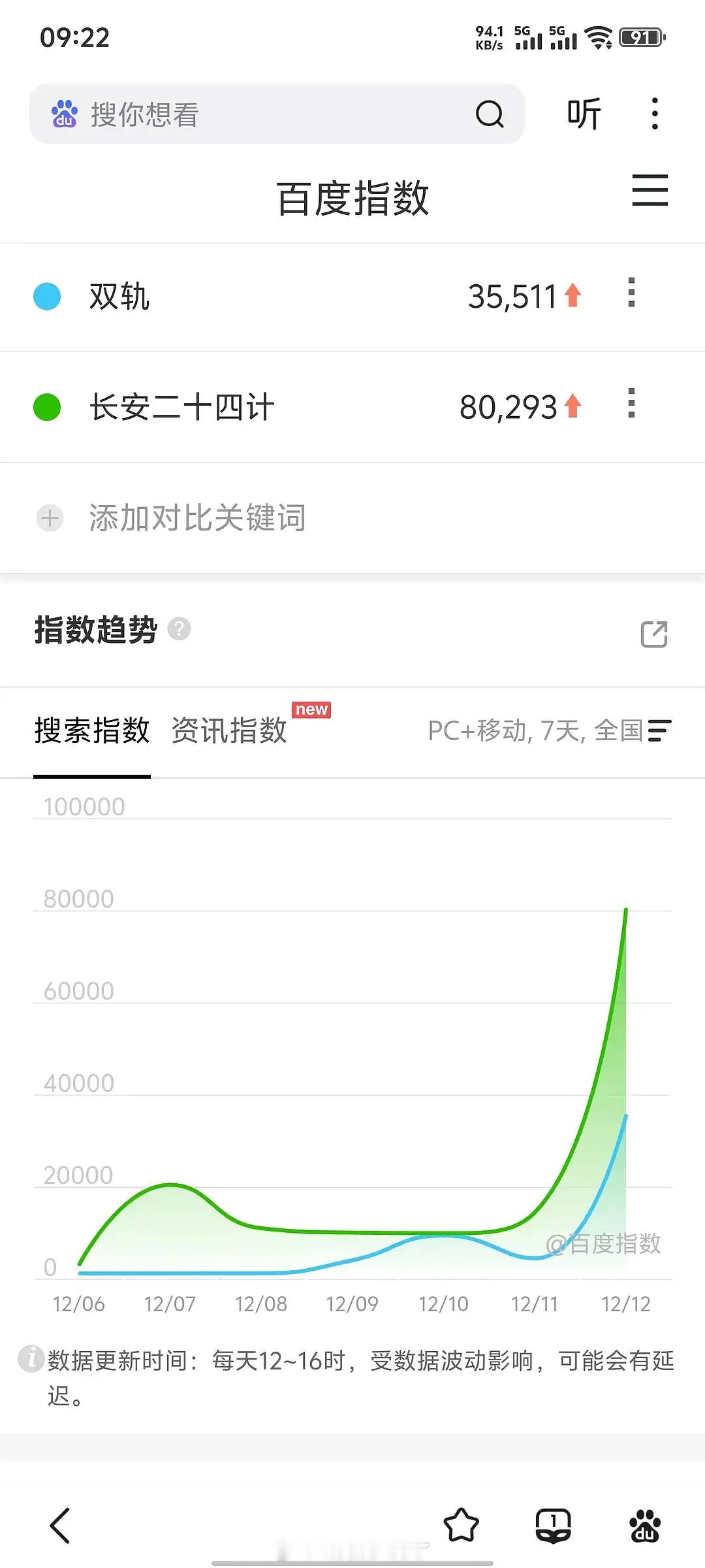 《双轨》和《长安二十四计》的百指一览。双轨热度走势