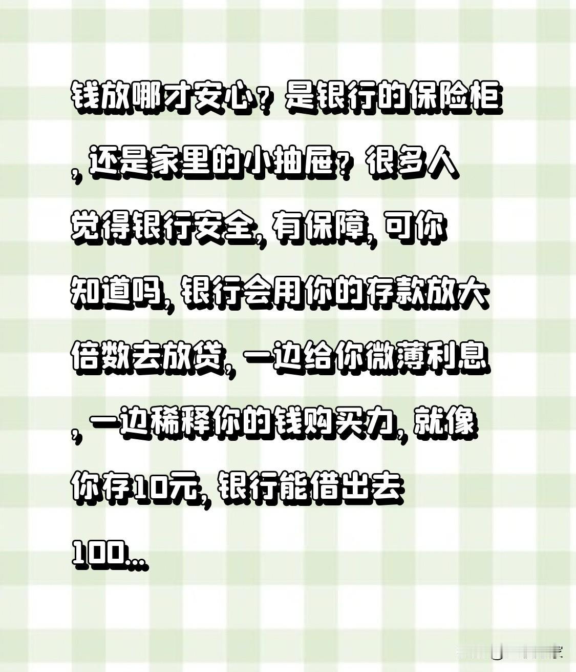 钱放哪才安心?是银行的保险柜,还是家里的小抽屉?很多人觉得银行安全,有保障,可你知道吗,银行会用你的存款放大倍数去放贷,一边给你微薄利息,一边稀释你的钱购买力,就像你存10元,银行能借出去100元,你的钱实际就贬值了。 但放家里也有问题,钱不流动对国家经济也不利,而且家里万一被盗或者出现意外,钱就没了。还有些中老年人存钱想留给孩子或养老,结果可能孩子也顾不上自己。 你会怎么选呢?是银行还是家里?钱该留给孩子还是自己养老?怎样存钱才能不贬值? 存放现金小讲究 存款不能取 存放现金小讲究 现金安全隐忧 放现金 现金使用禁忌 包里放钱 金库保险柜 现金存放盒