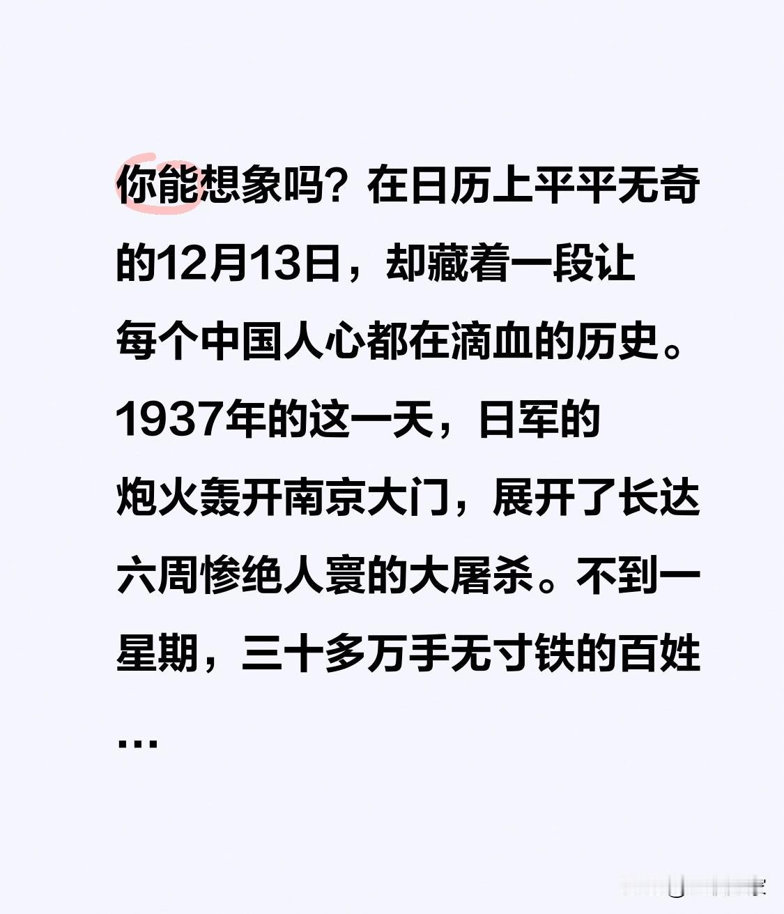 你能想象吗?在日历上平平无奇的12月13日,却藏着一段让每个中国人心都在滴血的历史。1937年的这一天,日军的炮火轰开南京大门,展开了长达六周惨绝人寰的大屠杀。不到一星期,三十多万手无寸铁的百姓惨遭杀害,他们被当作活靶子、被活埋、被推进长江,甚至连未满月的孩童都没能幸免。 如今,我们生活在和平年代,可这段历史不能忘。国家公祭日,是对逝者的缅怀,更是对未来的警醒。大家觉得我们该以怎样的方式铭记这段历史?又该如何传承先辈们不屈的精神?在新时代,我们怎样才能让国家更加强大? 南京日历 南京大屠杀 南京大屠杀 第十一个公祭日 南京日历