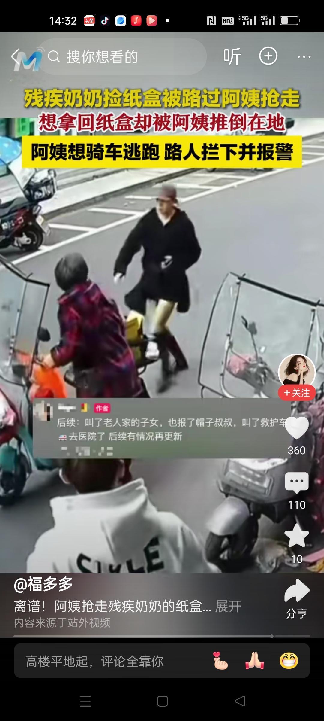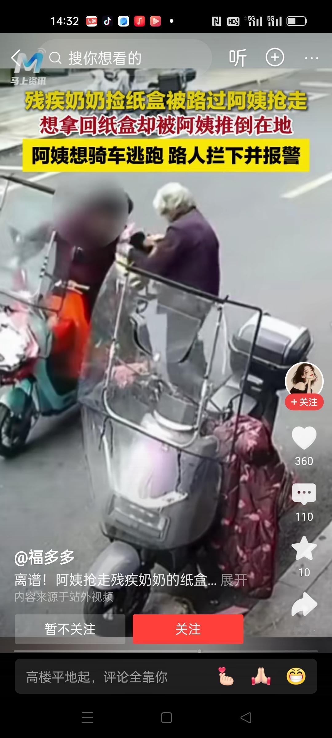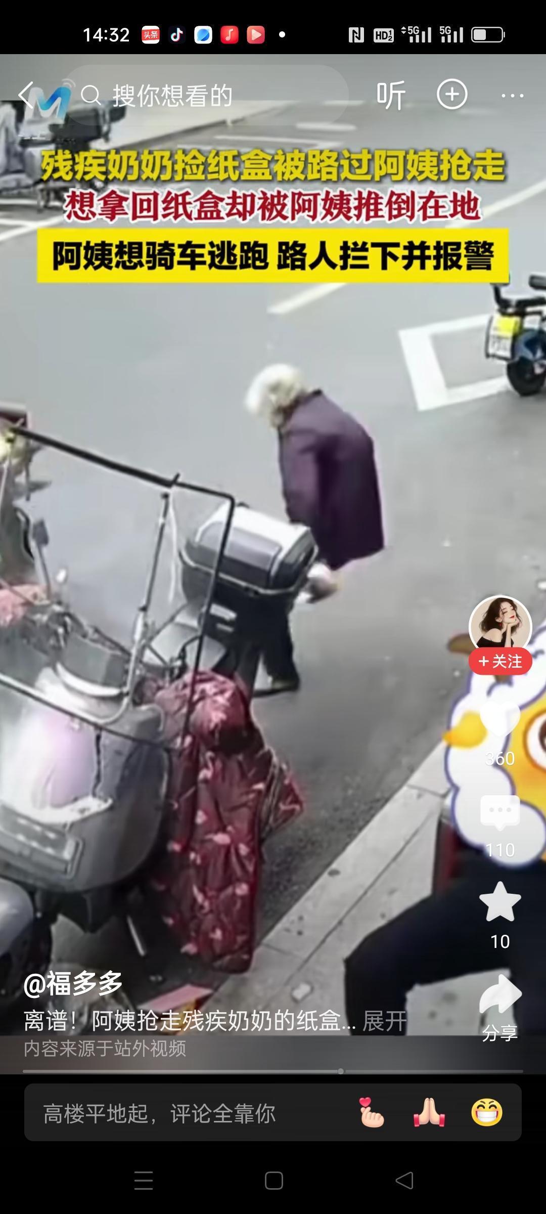 一女子抢走残疾老奶奶捡的纸盒,老奶奶腿脚不便,随后追赶,想拿回纸盒。不料女子竟然推开老奶奶,致使其倒地。 女子还想逃离,被路过群众拦住,并报警。这女子这个事都干的出来。捡破烂就不容易,还要抢别人的捡的现成的,这是骨子里纯坏啊!她就不想想,自己也会变老,不怕到时候别人也来欺负她吗? 警察叔叔不要放过她,好好治理她,教教她如何尊老爱幼做个好人