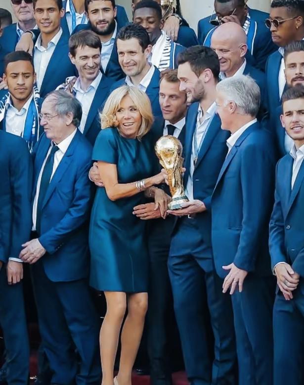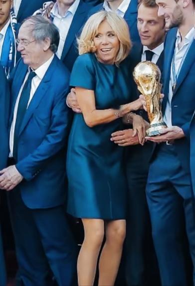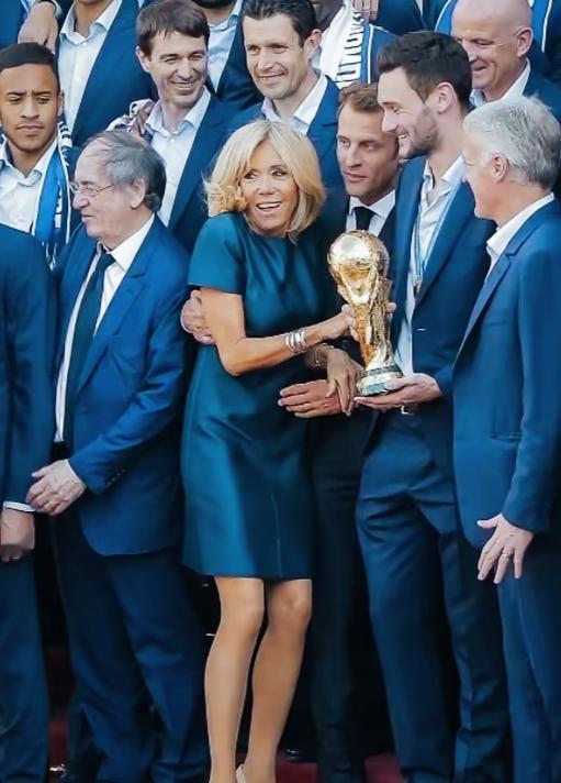 马克龙妻子这站姿是不是挺特别啊? 被马克龙这样搂着,是不是不好意思了? 毕竟边上站着的都是男士啊! 脸上微笑的表情是什么意思呢?