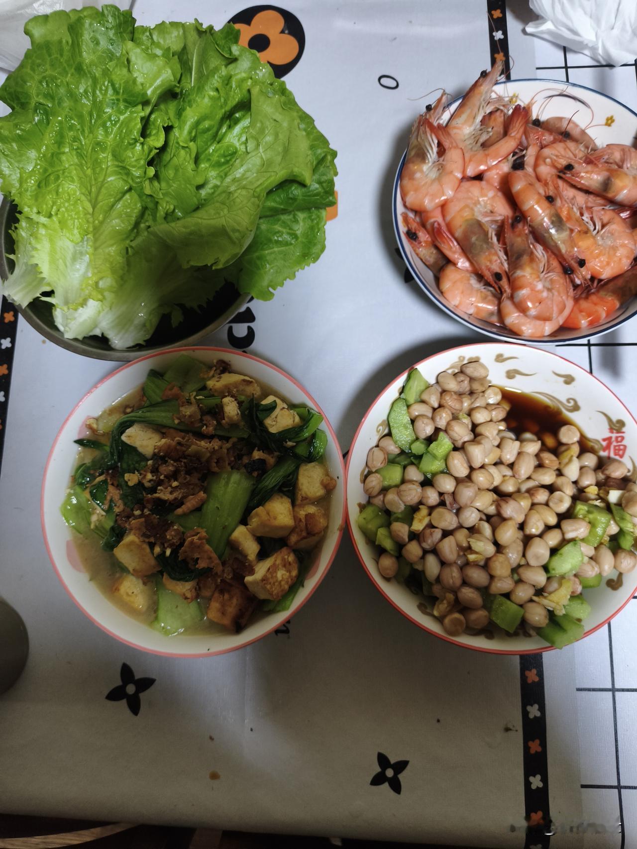 今天周末,一家五口人依然五个菜,锅里正炖着一个地锅排骨,就快出锅了[笑哭]还有一个生菜,一盘大虾,一盘花生米调黄瓜,一盘海米豆腐青菜,简简单单又是一餐[呲牙][祈祷] 昨晚我们这下雪了,今天下午又下雪了,听说这次好像是人工降雪,也不知道是真是假,不过到了这个月份,就是下雪也是很正常的! 这会豆浆机里还打着豆浆,也快好了,天气冷喝点热乎乎的豆浆,不比喝酒强吗?还营养健康! 最后还是那句口号,简简单单的又是一餐,快快乐乐的又是一天[呲牙][祈祷]