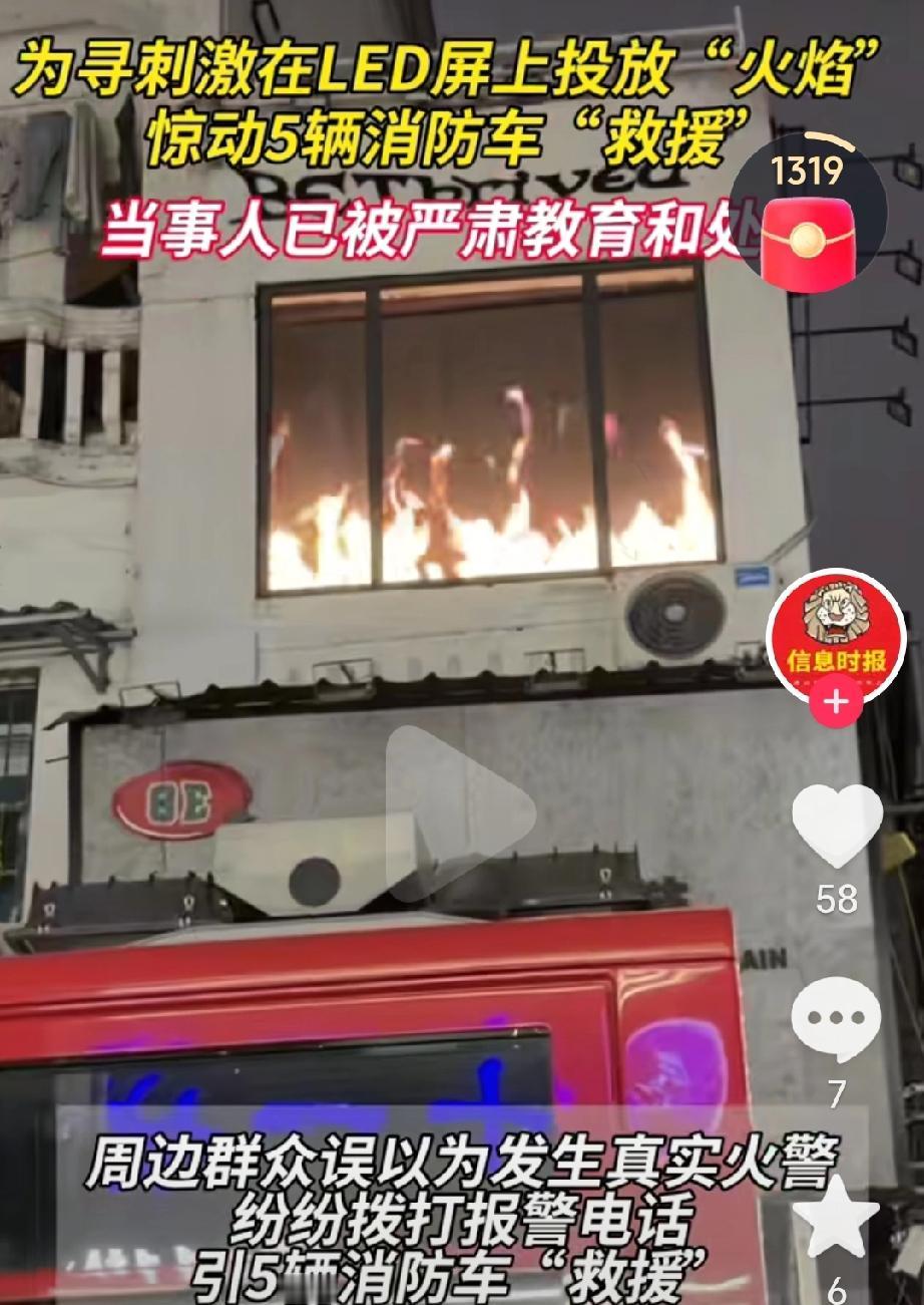 在窗户外LED屏上 投放逼真火灾场景视频 这事发生在12月10日下午的广州荔湾区岭南街 。涉事当事人为寻求刺激,在窗户外的LED屏上投放逼真的火灾场景视频,周边群众误以为真火情纷纷报警 。辖区消防救援部门紧急调派了5台消防车赶赴现场,到场后才发现是一场乌龙 。 事件发生后,岭南街办事处与辖区派出所迅速介入调查并锁定当事人 。因当事人的行为已扰乱公共秩序,造成不良社会影响,相关部门已依法对其作出严肃批评教育和行政处罚,当事人当场作出了悔改承诺。消防部门也提醒,这类虚假警情会无端占用宝贵的消防救援资源,还可能延误其他真实紧急警情的处置,而故意编造、传播虚假警情信息扰乱公共秩序的行为,都会被依法追究法律责任。