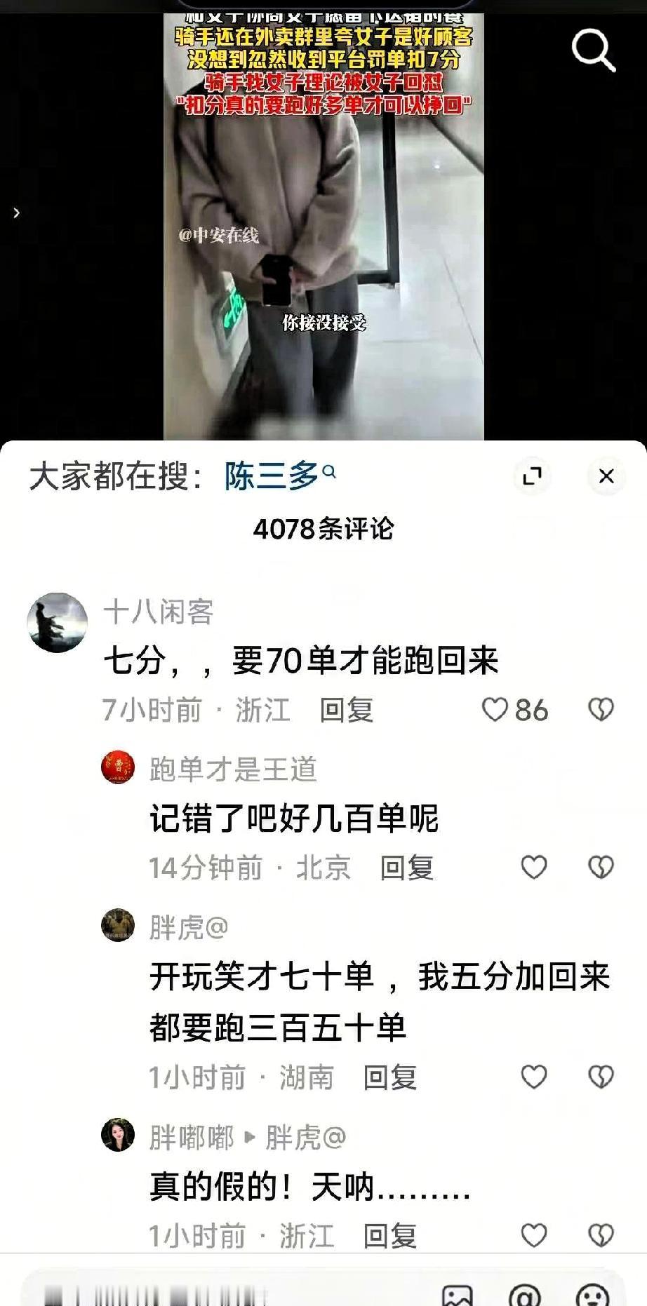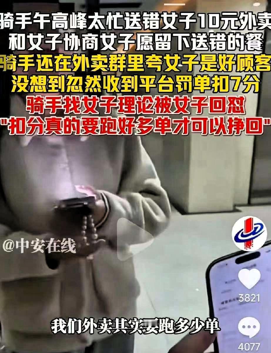 安徽,一骑手给女顾客送错了餐,他也觉得很抱歉。 主动给女顾客提出解决方案:要么留下送错的餐免费吃,要么他把餐带走赔钱,要么重新买一份送过来。女顾客当场选了留下餐,还说不用赔钱,骑手满心感激,转头就在外卖群里夸自己遇上了好人。 可他刚夸完没多久,就收到了平台的处罚通知,直接被扣了7分。要知道,有同行说跑300多单才能补回5分,这7分对靠跑单赚辛苦钱的骑手来说,无疑是不小的打击。 骑手又气又懵,赶紧找到女顾客质问,没想到对方却换了一副说辞。女顾客理直气壮地表示,自己找平台申请退款是自己的事,跟骑手没关系,还强调那份餐她根本不喜欢,之前也没同意骑手的任何方案。 骑手当场就无语了,他反驳说当时明明协商好了,餐也被顾客留下了,怎么就不算同意了?更让人难以理解的是,当骑手问起那份餐的去向时,女顾客轻描淡写地说“不喜欢就扔了”。 骑手送错餐确实有错,但他已经主动承担责任,积极补救。顾客这种当面一套背后一套的行为,实在有失诚信。 更让人无奈的是,平台的处罚规则往往更偏向顾客,骑手在这类纠纷里,往往只能吃哑巴亏。风里来雨里去的骑手挣的都是血汗钱,人与人之间的体谅本该是相互的,少一点算计,多一点真诚,才能让彼此都少些麻烦。