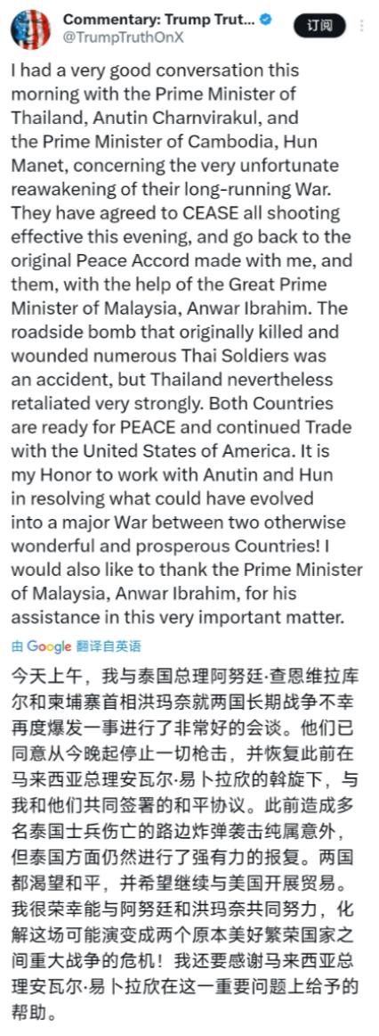 特朗普总算是干了件正事!   12月13日,美国总统特朗普发文:“今天上午,我与泰国总理阿努廷·查恩维拉库尔和柬埔寨首相洪玛奈就两国长期战争不幸再度爆发一事进行了非常好的会谈。两国都渴望和平,并希望继续与美国开展贸易。”   说白了,这次会谈是真的可以看出特朗普在为了和平做出努力。   要知道,近期,特朗普拿到“足联和平奖”的事件,引起了是少国家的讥讽,都说特朗普是在用“霸权”控制战场,拿到这个奖项,也全是自导自演,自欺欺人的戏码,但是这次是真没有自吹,他尽力的在和两国总统斡旋,并且大概率能让这场重大战争的危机化解。 这个说法听起来确实像是那么回事。如果属实,那无疑是一次成功的外交斡旋,足以让特朗普的形象加分不少。毕竟,在国际舞台上,能平息战火、促进和平的领导人,总会赢得尊重。文章里还特意将这件事与他之前获得“足联和平奖”的事件做了对比。 那个所谓的“和平奖”当时在国际上引发了巨大的嘲讽,很多人认为那不过是特朗普自导自演的一场闹剧,一个用“霸权”姿态为自己脸上贴金的戏码,根本经不起推敲。所以,这次的泰柬和谈,被描绘成了一次“真刀真枪”的努力,是一次没有自吹自擂的实际行动。 但仔细琢磨一下,这件事似乎处处透着蹊跷。泰国和柬埔寨,这两个东南亚邻国,虽然历史上存在过一些摩擦和边境争端,比如著名的柏威夏寺问题,但近年来关系总体平稳,经贸往来密切,哪里来的“长期战争不幸再度爆发”? 这样重大的国际事件,倘若真的发生,全球各大主流媒体不可能没有铺天盖地的报道,又怎么会只在一个小圈子里流传,并且由一位前美国总统来宣布调停成功?这本身就像一个巨大的问号,悬在读者心头。 这或许就引出了一个更有意思的话题:为什么这样一个听起来不太靠谱的消息,却能引发“特朗普总算干了件正事”的共鸣?这背后反映的,可能是一种复杂的社会心态。 特朗普作为一个极具争议的人物,他的支持者和反对者都立场鲜明。对于反对者来说,他们习惯了批评他的各种出格言行; 而对于一些中间派或者潜在的同情者而言,他们或许也期待着特朗普能展现出超越党派之争、真正为世界和平做贡献的一面。这种期待,使得人们更愿意去相信一个“浪子回头金不换”的故事。 再联想到特朗普在任期内确实促成过一些外交突破,比如推动以色列与阿联酋、巴林等阿拉伯国家关系正常化的《亚伯拉罕协议》。尽管这些协议同样伴随着巨大的争议,但不可否认,它们在一定程度上改变了中东的地缘政治格局。 这些真实存在的“高光时刻”,为“特朗普能办成事”的叙事提供了土壤。于是,当“调停泰柬战争”这样的消息出现时,人们很容易将其与《亚伯拉罕协议》联系起来,认为这或许是他卸任后,依然在发挥“余热”,进行着低调而有效的私人外交。 然而,信息的真伪终究是第一位的。在没有确凿证据的情况下,任何激动人心的“好消息”都可能只是精心编织的叙事。那个所谓的“足联和平奖”之所以被讥讽,就是因为它源于一个不存在的组织,是一场自我加冕。 这次的“泰柬和谈”,会不会是另一个版本的“和平奖”?只是这次的包装更加巧妙,利用了人们对地缘政治冲突的焦虑和对和平的渴望,把故事讲得更加逼真。 这件事就像一面镜子,照出的不仅仅是特朗普本人的行事风格,更是我们这个时代信息传播的特点和大众心理的弱点。 在海量信息冲刷下,人们越来越倾向于相信那些符合自己情感和立场的故事,而忽略了去核实事实的根基。一个故事只要足够动人,就拥有了病毒式传播的潜力。 那么,这究竟是一场不为人知的高层秘密外交,还是又一次被巧妙包装的舆论操作?或者说,我们看到的,其实只是我们内心深处希望看到的那一部分真相?这个问题,恐怕比事件本身更值得我们深思。你的看法又是什么呢?不妨一起来聊聊。