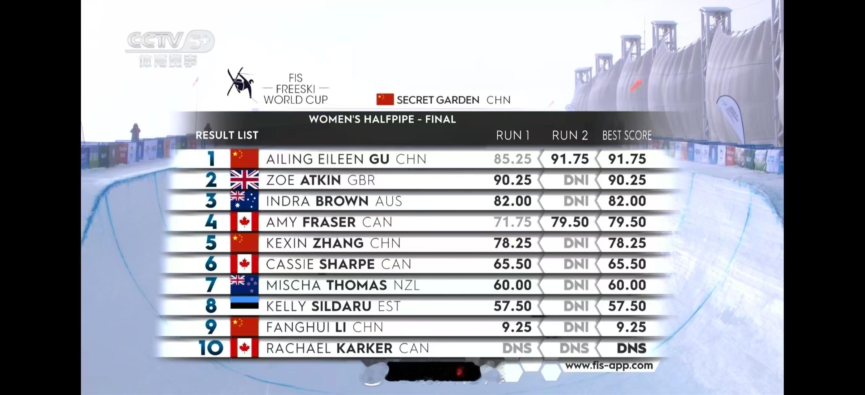 2025-26赛季自由式滑雪U型场地技巧世界杯🇨🇳崇礼站女子决赛🥇🇨🇳谷爱凌91.75分,收获自己本赛季世界杯第一冠,也完成了U型场地世界杯云顶站的三连冠。🥈🇬🇧阿特金90.25分🥉🇦🇺因德拉·布朗82.00分5.🇨🇳张可欣78.25分9.🇨🇳李芳慧9.25分谷爱凌世界杯逆转夺冠谷爱凌赛季第二金世界杯云顶站谷爱凌三连冠