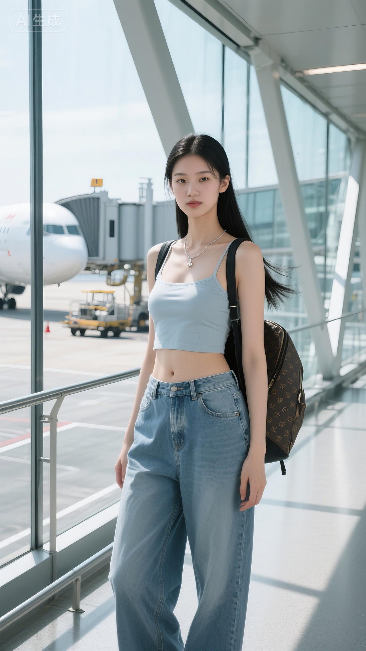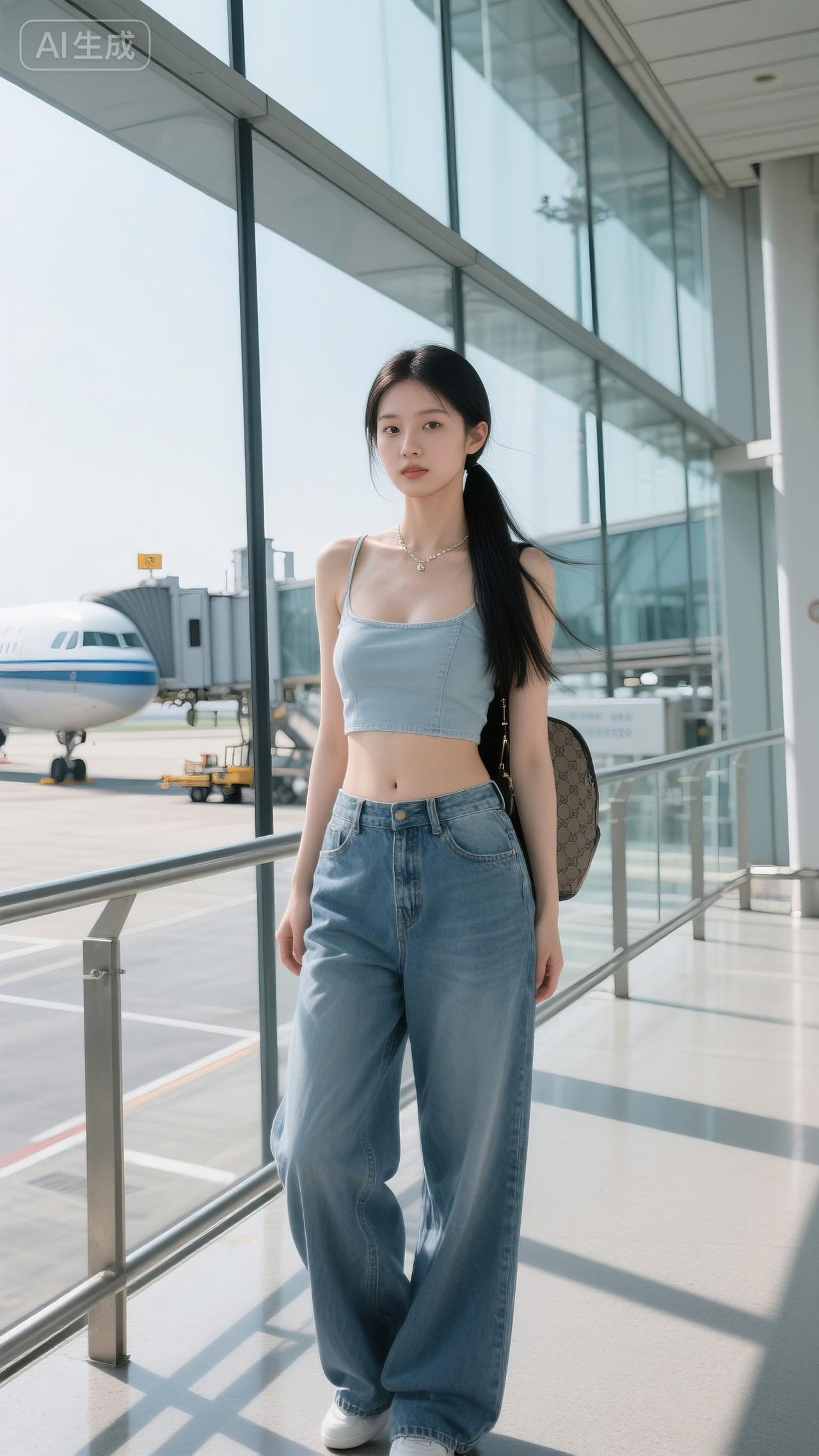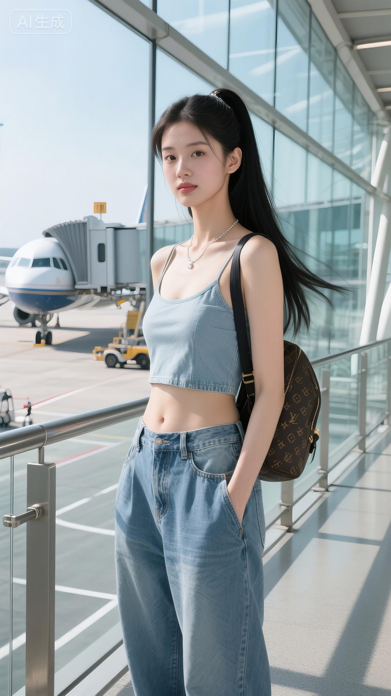 机场落地窗浸着天光,浅蓝吊带搭阔腿牛仔,马尾轻扬时,连赶路的风都染了松弛的甜。