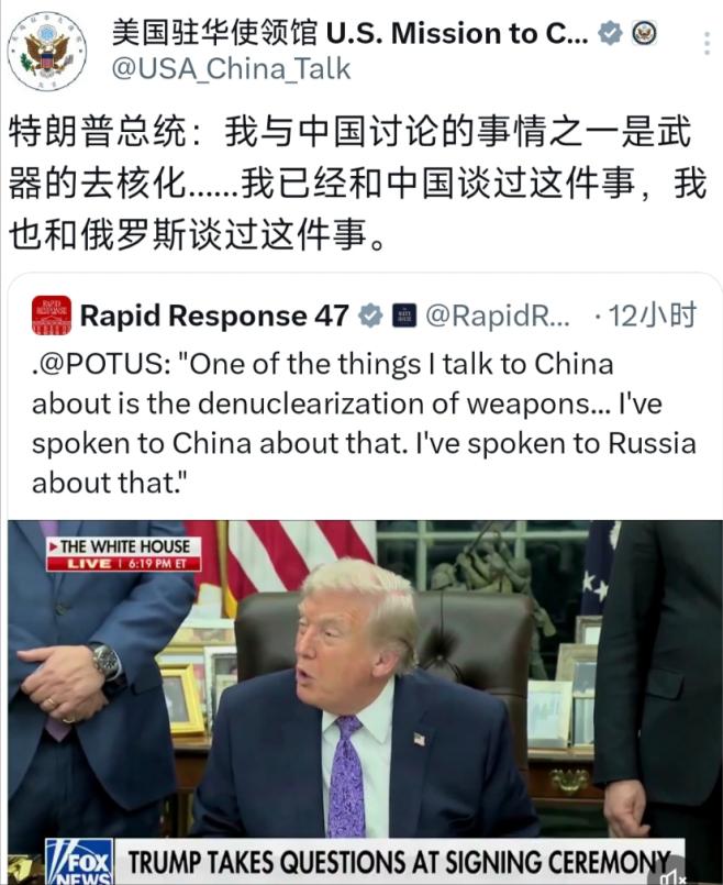 12月12日,美国驻华使领馆发表:“特朗普总统:我与中国讨论的事情之一是武器的去核化……我已经和中国谈过这件事,我也和俄罗斯谈过这件事。” 说白了,这可能是美国的阴谋,核武器是防止国家被侵略的最后底牌,当去掉核武器,美国的霸权行为将更上一个层次。 要知道,美国作为北约国家的一员,在俄乌战争中,对乌克兰有着巨额的资金投入,现在资金都没法回笼,美国想要叫停这场战争,但是美国也无能为力,一边是北约的同盟国,一边是有着全球最大核武器库的俄罗斯,这让美国陷入被动。 更何况,现在美国的经济也面临着挑战,去核武还可以减少美国对核武器维护的资金支出,对美国来说是百利无一害的。 说实话,没有了核武器的存在,该担心的就是中国和俄罗斯了,毕竟北约国家一直在东扩,成员国家有着30多个,绝不是中国和俄罗斯可以轻易抗衡的。 说白了,核武器这东西,自从它诞生那天起,就不仅仅是一件武器了。它更像是一个国家最后的“护身符”,是悬在潜在侵略者头顶的达摩克利斯之剑。 正是因为有了这柄剑的存在,大国之间才形成了一种微妙的恐怖平衡,谁也不敢轻易按下那个毁灭性的按钮。 一旦这个平衡被打破,当所有国家都赤手空拳地站在擂台上时,谁的肌肉最发达,谁的拳头最硬,谁就能制定规则。 这么一想,美国作为当今世界唯一的超级大国,又是北约这个庞大军事集团的核心,它的常规军事实力无人能及。如果大家真的都把核武器给“去”了,那它岂不是如虎添翼? 我们不妨换个角度想想,美国真的能和它的盟友们“同甘共苦”吗?别忘了“核保护伞”这个概念。美国为日本、韩国以及欧洲的众多北约盟友提供了核威慑的保障。这意味着,即便这些国家自己没有核武器,它们也头顶着美国的核大伞。 在这种背景下,如果美国推动全球去核,真正被缴械的可能是那些独立自主的核大国,而美国的军事同盟体系却依然稳固。这种不对等的“安全”,对某些国家来说,恐怕不是福音,而是一个巨大的陷阱。 再来看看经济账。维持一支庞大且现代化的核武库,那可是个吞金巨兽。从研发、制造到维护、更新,每一个环节都需要天文数字的资金投入。美国自身也面临着不小的经济压力,国内的基础设施建设、社会福利等问题都需要大量的财政支持。 如果能通过“去核化”来削减这笔巨额开支,把省下来的钱用在刀刃上,对美国来说无疑是笔划算的买卖。 可问题在于,我们看到的是美国一边喊着要削减核武器,另一边却在投入数千亿美元升级自己的核武库,比如研发新型的低当量核弹头和B-21隐形战略轰炸机。这种言行不一的做法,很难不让人怀疑其真实动机。 当下的国际局势,也让这场关于“去核化”的讨论变得更加敏感。俄乌冲突的硝烟至今未散,这场战争不仅让欧洲的安全格局发生了剧烈变化,也让美国深陷其中。 一方面要源源不断地向乌克兰提供巨额的军事和经济援助,另一方面又得小心翼翼地避免与拥有全球最大核武库的俄罗斯发生直接冲突。 这种被动的局面,或许让美国更加渴望改变游戏规则。如果俄罗斯没有了核威慑这张底牌,那么它在乌克兰问题上的立场还能如此强硬吗?北约的东扩步伐,是不是会更加肆无忌惮? 所以,当“去核化”这个议题被再次摆上台面时,我们不能只听它说了什么,更要看它做了什么,以及它所处的环境是什么。这背后牵扯的不仅仅是军备控制的技术问题,更是大国之间深刻的战略博弈和地缘政治的复杂算计。 这盘棋的每一步,都可能影响到未来几十年的世界格局。那么,你认为这究竟是一条通往和平的光明大道,还是一条通往单极霸权的幽暗小径呢?这或许值得我们每个人深入思考。