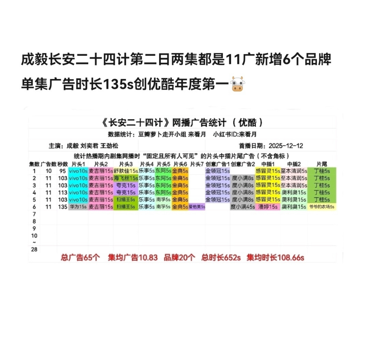 成毅长安二十四计单集广告时长135s创优酷年度第一❗️两集都是11广新增6个品牌❗🐮