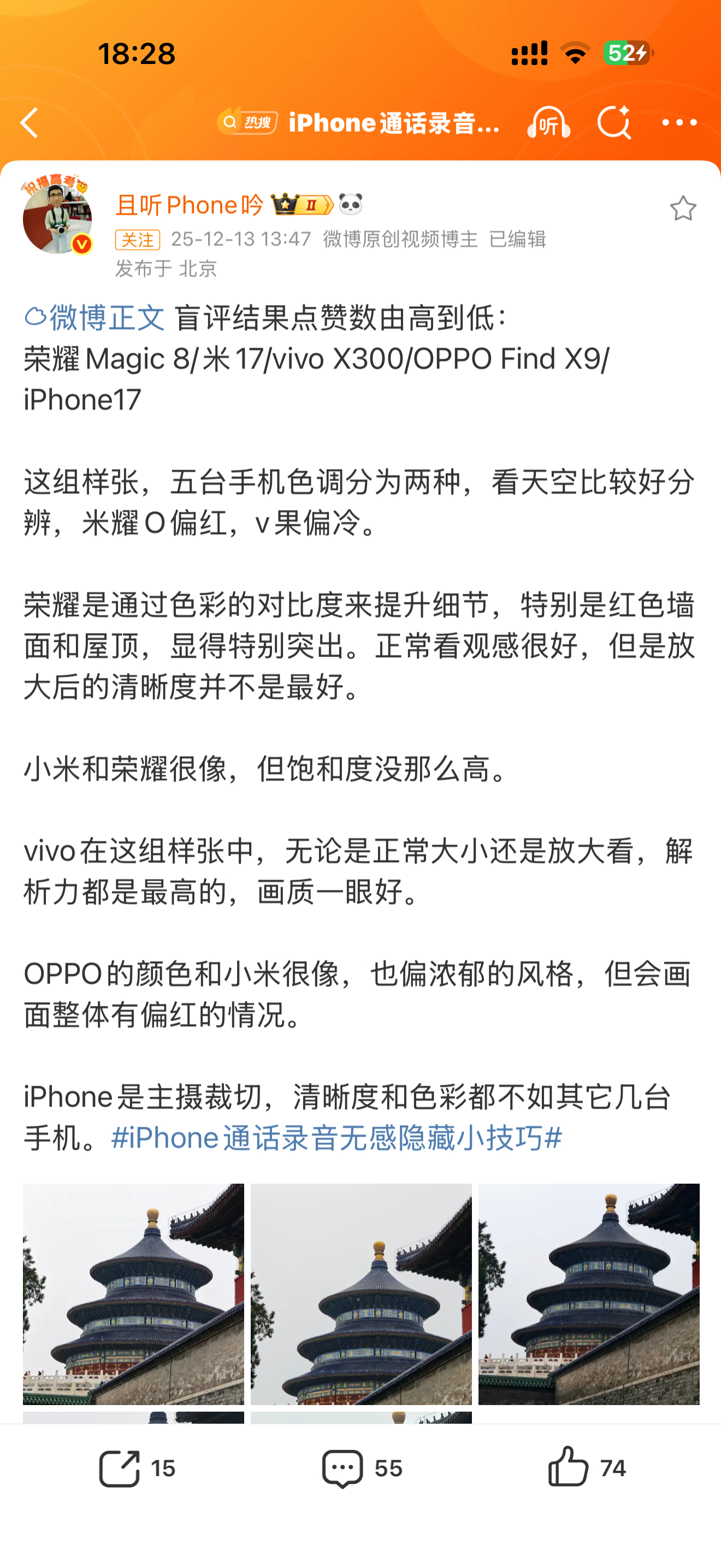 各家标准版影像盲评,荣耀Magic8又是第一,要知道这是盲评,所以不存在主观判断,就是看你最舒服的一张,直接投票就行。今年Magic8系列的影像风格是很自然的,而且看起来是最舒服,进步很大。