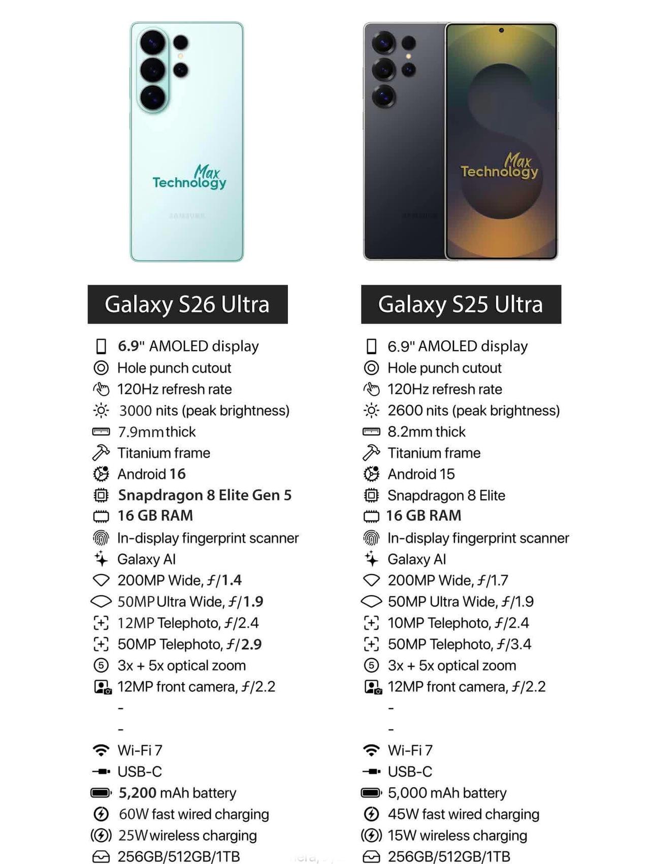 三星Galaxy S26 Ultra的一些消息更新,可能会有多达6款颜色,电池容量增加至5200毫安时,快充升级至60W有线和25W无线,主摄和长焦光圈增大,中焦升级为1200万像素,整机厚度7.9毫米,使用第五代骁龙8 for Galaxy,屏幕峰值亮度3000尼特。