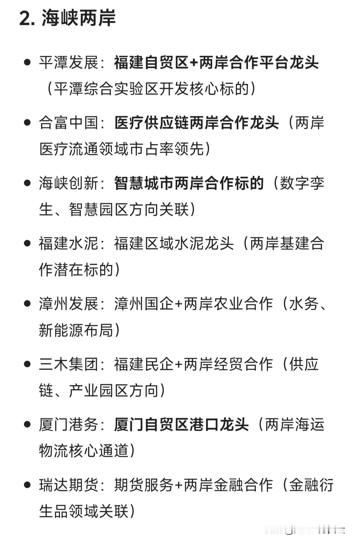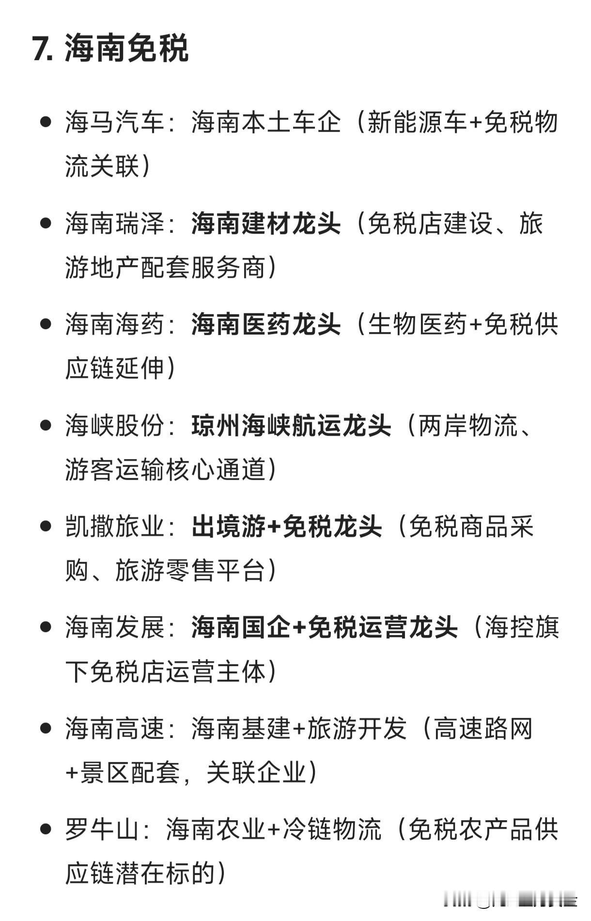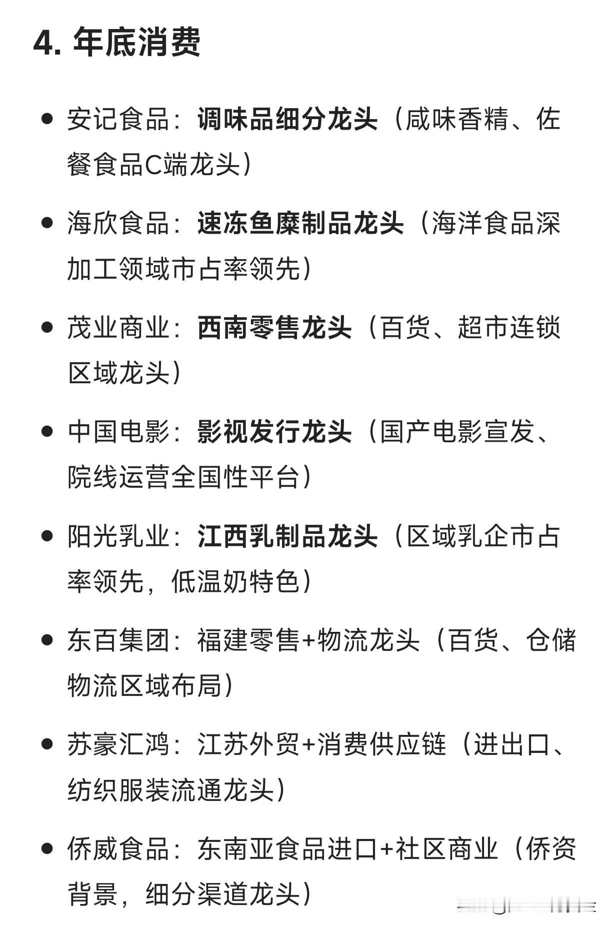 跨年热门题材关联龙头企业清单 1. 商业航天 - 航天发展:军用航天装备细分龙头 - 航天电子:航天电子系统龙头 - 中国卫星:小卫星研制龙头 - 中天火箭:航天箭体结构细分龙头 - 通宇通讯:航天通信地面设备供应商(关联企业) - 航天环宇:航天器结构件供应商(关联企业) - 特发信息:光纤通信+航天光电器件(关联企业) - 航天动力:液体火箭发动机技术转化(特种泵阀细分领先) 2. 海峡两岸 - 平潭发展:福建自贸区+两岸合作平台龙头 - 合富中国:医疗供应链两岸合作龙头 - 海峡创新:智慧城市两岸合作标的 - 福建水泥:福建区域水泥龙头 - 漳州发展:漳州国企+两岸农业合作 - 三木集团:福建民企+两岸经贸合作 - 厦门港务:厦门自贸区港口龙头 - 瑞达期货:期货服务+两岸金融合作 3. 太空算力 - 乾照光电:空间光电子龙头 - 上海瀚讯:军用5G+太空通信龙头 - 四川金顶:钙钛矿光伏+太空能源 - 中科星图:数字地球龙头 - 顺灏股份:包装+太空新材料 - 雷科防务:卫星导航信号处理龙头 - 普天科技:智慧政务+太空数据应用 - 开普云:政务大数据+空天信息整合 4. 年底消费 - 安记食品:调味品细分龙头 - 海欣食品:速冻鱼糜制品龙头 - 茂业商业:西南零售龙头 - 中国电影:影视发行龙头 - 阳光乳业:江西乳制品龙头 - 东百集团:福建零售+物流龙头 - 苏豪汇鸿:江苏外贸+消费供应链 - 侨威食品:东南亚食品进口+社区商业 5. 医药流感 - 海王生物:医药流通龙头 - 瑞康医药:山东医药流通龙头 - 特一药业:止咳退烧药龙头 - 众生药业:创新药龙头 - 人民同泰:黑龙江医药零售龙头 - 华人健康:连锁药店龙头 - 广济药业:维生素B2龙头 - 粤万年青:岭南中成药龙头 6. 机器人 - 襄阳轴承:汽车轴承龙头 - 恒立液压:工程机械液压龙头 - 隆盛科技:微特电机龙头 - 长盛精密:工业机器人结构件 - 斯莱股份:机器人伺服电机 - 三花智控:制冷控制龙头 - 五洲新春:轴承套圈龙头 - 汉威科技:气体传感器龙头 7. 海南免税 - 海马汽车:海南本土车企 - 海南瑞泽:海南建材龙头 - 海南海药:海南医药龙头 - 海峡股份:琼州海峡航运龙头 - 凯撒旅业:出境游+免税龙头 - 海南发展:海南国企+免税运营龙头 - 海南高速:海南基建+旅游开发(关联企业) - 罗牛山:海南农业+冷链物流 8. AI应用 - 榕基软件:电子政务软件龙头 - 蓝色光标:营销科技龙头 - 易点天下:出海营销龙头 - 道明光学:反光材料龙头 - 福蓉科技:消费电子金属件 - 南威软件:数字政府龙头 - 中兴通讯:通信设备龙头 - 品高股份:云计算龙头