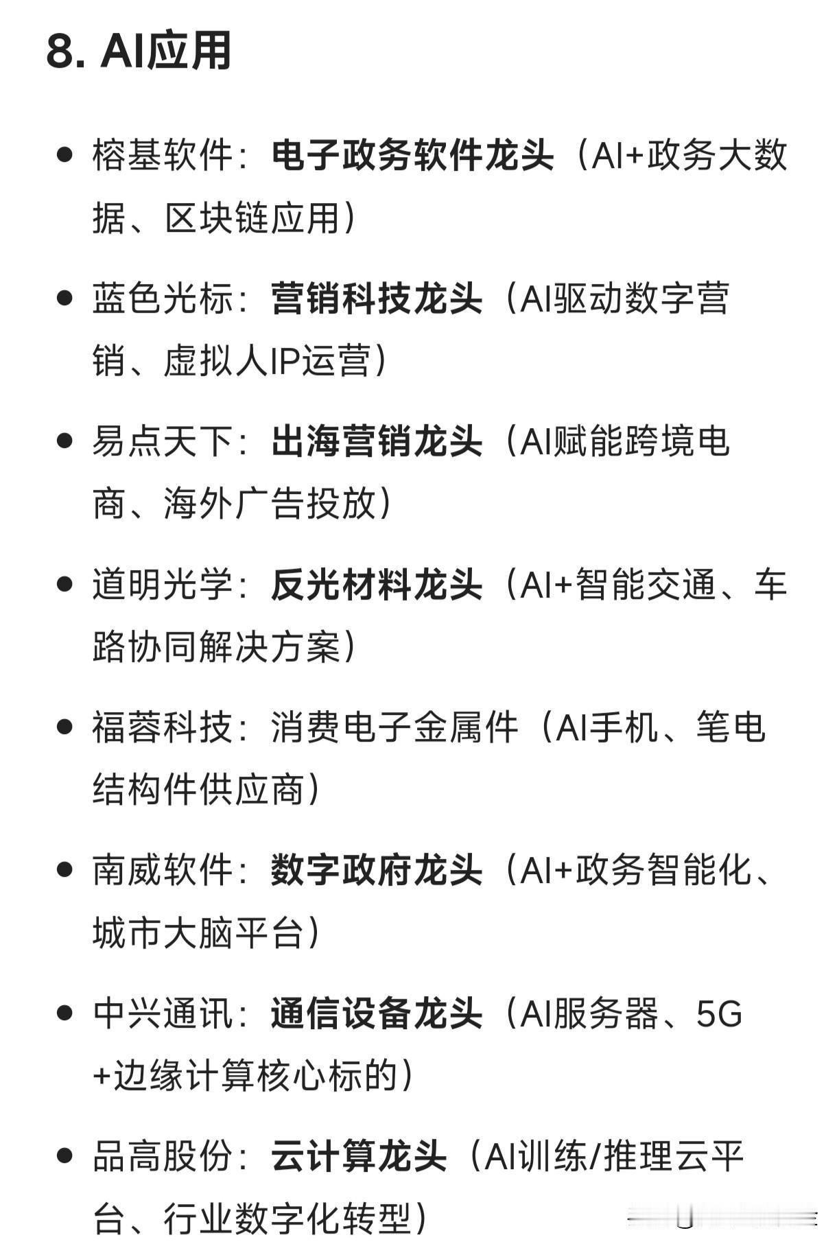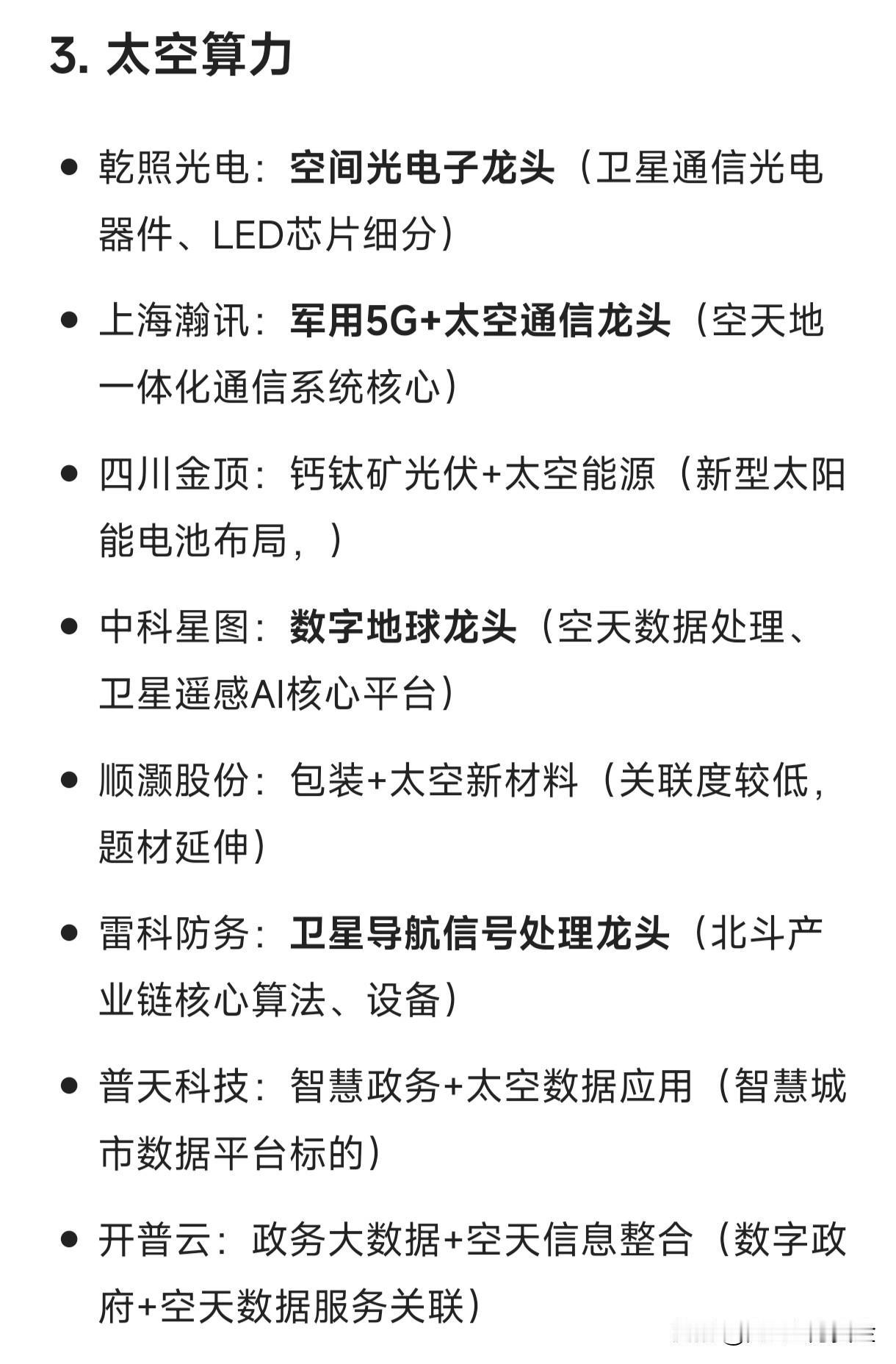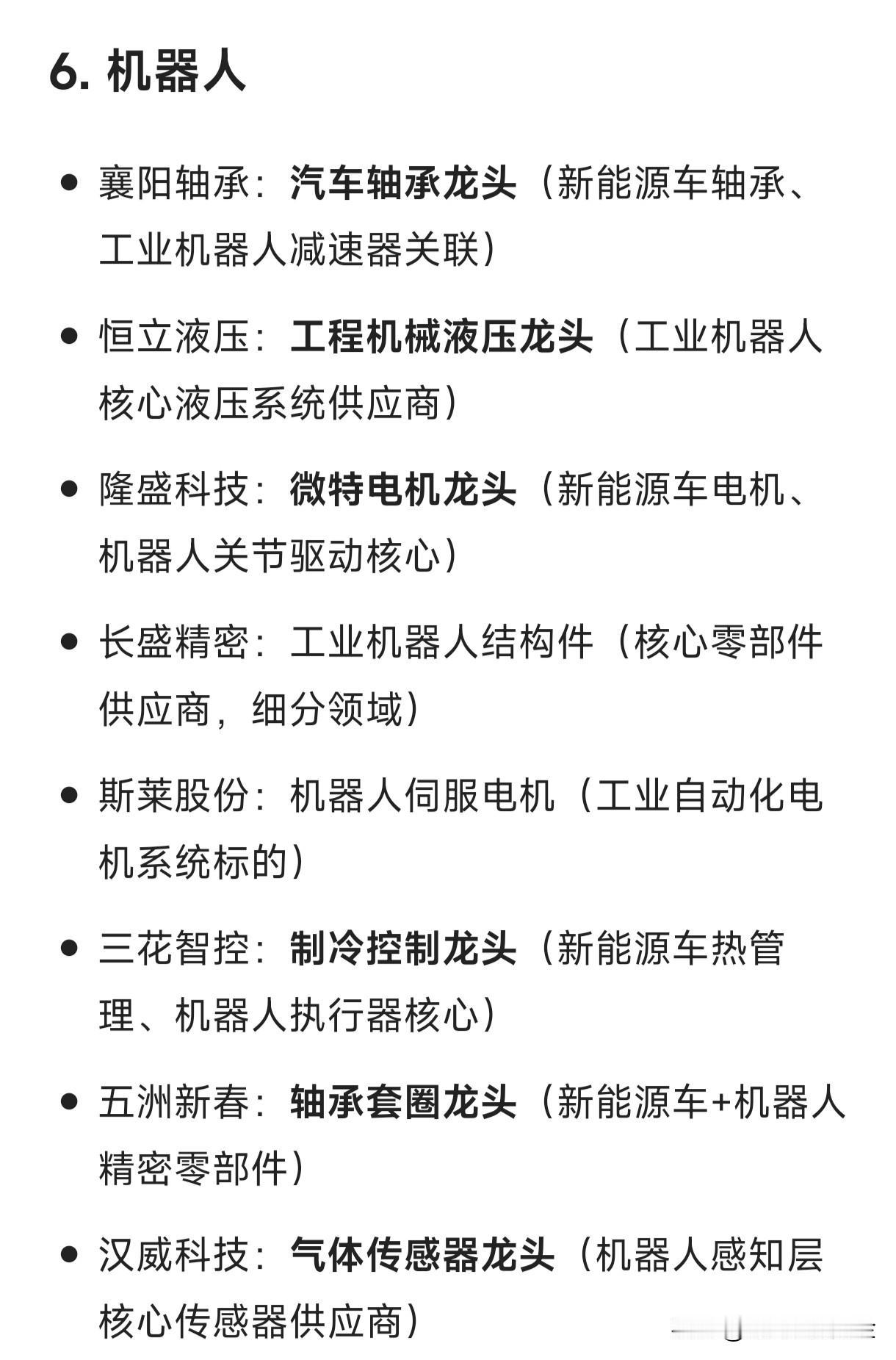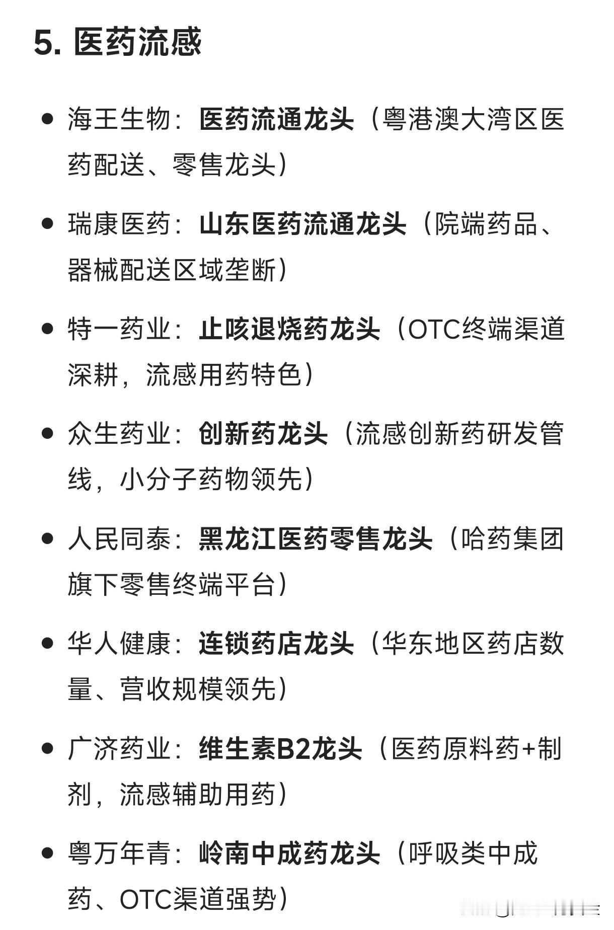 跨年热门题材关联龙头企业清单 1. 商业航天 - 航天发展:军用航天装备细分龙头 - 航天电子:航天电子系统龙头 - 中国卫星:小卫星研制龙头 - 中天火箭:航天箭体结构细分龙头 - 通宇通讯:航天通信地面设备供应商(关联企业) - 航天环宇:航天器结构件供应商(关联企业) - 特发信息:光纤通信+航天光电器件(关联企业) - 航天动力:液体火箭发动机技术转化(特种泵阀细分领先) 2. 海峡两岸 - 平潭发展:福建自贸区+两岸合作平台龙头 - 合富中国:医疗供应链两岸合作龙头 - 海峡创新:智慧城市两岸合作标的 - 福建水泥:福建区域水泥龙头 - 漳州发展:漳州国企+两岸农业合作 - 三木集团:福建民企+两岸经贸合作 - 厦门港务:厦门自贸区港口龙头 - 瑞达期货:期货服务+两岸金融合作 3. 太空算力 - 乾照光电:空间光电子龙头 - 上海瀚讯:军用5G+太空通信龙头 - 四川金顶:钙钛矿光伏+太空能源 - 中科星图:数字地球龙头 - 顺灏股份:包装+太空新材料 - 雷科防务:卫星导航信号处理龙头 - 普天科技:智慧政务+太空数据应用 - 开普云:政务大数据+空天信息整合 4. 年底消费 - 安记食品:调味品细分龙头 - 海欣食品:速冻鱼糜制品龙头 - 茂业商业:西南零售龙头 - 中国电影:影视发行龙头 - 阳光乳业:江西乳制品龙头 - 东百集团:福建零售+物流龙头 - 苏豪汇鸿:江苏外贸+消费供应链 - 侨威食品:东南亚食品进口+社区商业 5. 医药流感 - 海王生物:医药流通龙头 - 瑞康医药:山东医药流通龙头 - 特一药业:止咳退烧药龙头 - 众生药业:创新药龙头 - 人民同泰:黑龙江医药零售龙头 - 华人健康:连锁药店龙头 - 广济药业:维生素B2龙头 - 粤万年青:岭南中成药龙头 6. 机器人 - 襄阳轴承:汽车轴承龙头 - 恒立液压:工程机械液压龙头 - 隆盛科技:微特电机龙头 - 长盛精密:工业机器人结构件 - 斯莱股份:机器人伺服电机 - 三花智控:制冷控制龙头 - 五洲新春:轴承套圈龙头 - 汉威科技:气体传感器龙头 7. 海南免税 - 海马汽车:海南本土车企 - 海南瑞泽:海南建材龙头 - 海南海药:海南医药龙头 - 海峡股份:琼州海峡航运龙头 - 凯撒旅业:出境游+免税龙头 - 海南发展:海南国企+免税运营龙头 - 海南高速:海南基建+旅游开发(关联企业) - 罗牛山:海南农业+冷链物流 8. AI应用 - 榕基软件:电子政务软件龙头 - 蓝色光标:营销科技龙头 - 易点天下:出海营销龙头 - 道明光学:反光材料龙头 - 福蓉科技:消费电子金属件 - 南威软件:数字政府龙头 - 中兴通讯:通信设备龙头 - 品高股份:云计算龙头