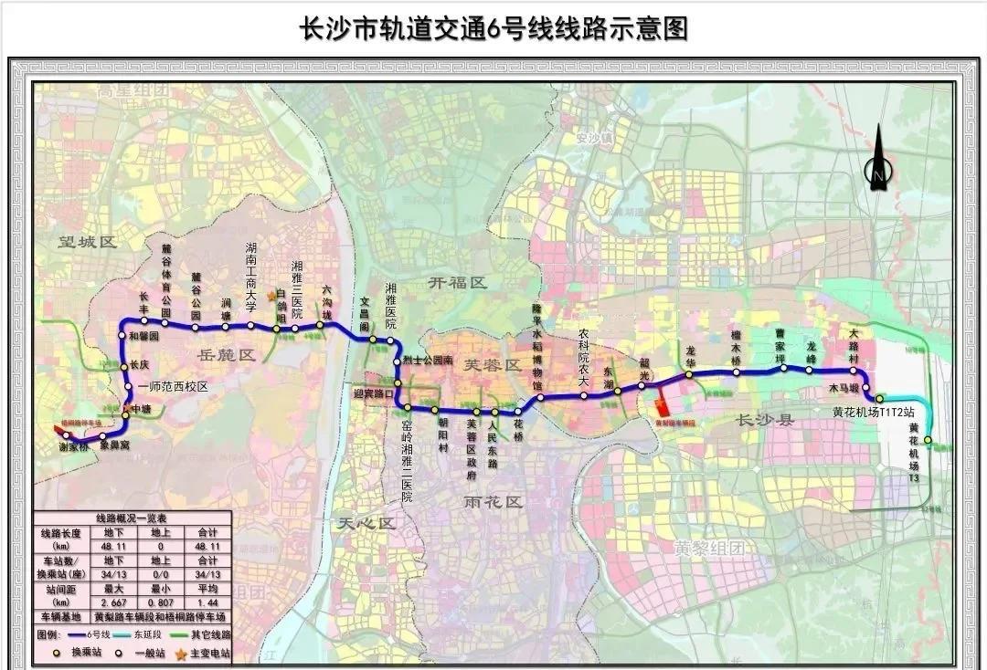长沙6号线 长沙轨道交通6号线是长沙轨道交通首条与广州地铁合作运营的线路,它起于谢家桥站,途经长沙市望城区、岳麓区、开福区、芙蓉区、雨花区、长沙县,横向贯通长沙城区、湖南湘江新区,止于黄花机场T1T2站,大致呈东西走向。 长沙轨道6号线东延段是湖南省首条连接机场航站楼的地铁线路。 长沙地铁6号线是长沙目前最长的地铁线,全长48.11千米,全部为地下线;共设置车站34座,均为地下站,其中换乘站12座;列车采用6节编组A型列车。 运营时间为每日6:30-23:00,周五、周六延长至24:00。线路途经岳麓区、开福区、芙蓉区等核心区域,设有多处换乘站,如六沟垅站(换乘4号线)、文昌阁站(换乘1号线)等。长沙地铁 地铁2号6号线 六号线通车 地铁6号线南延