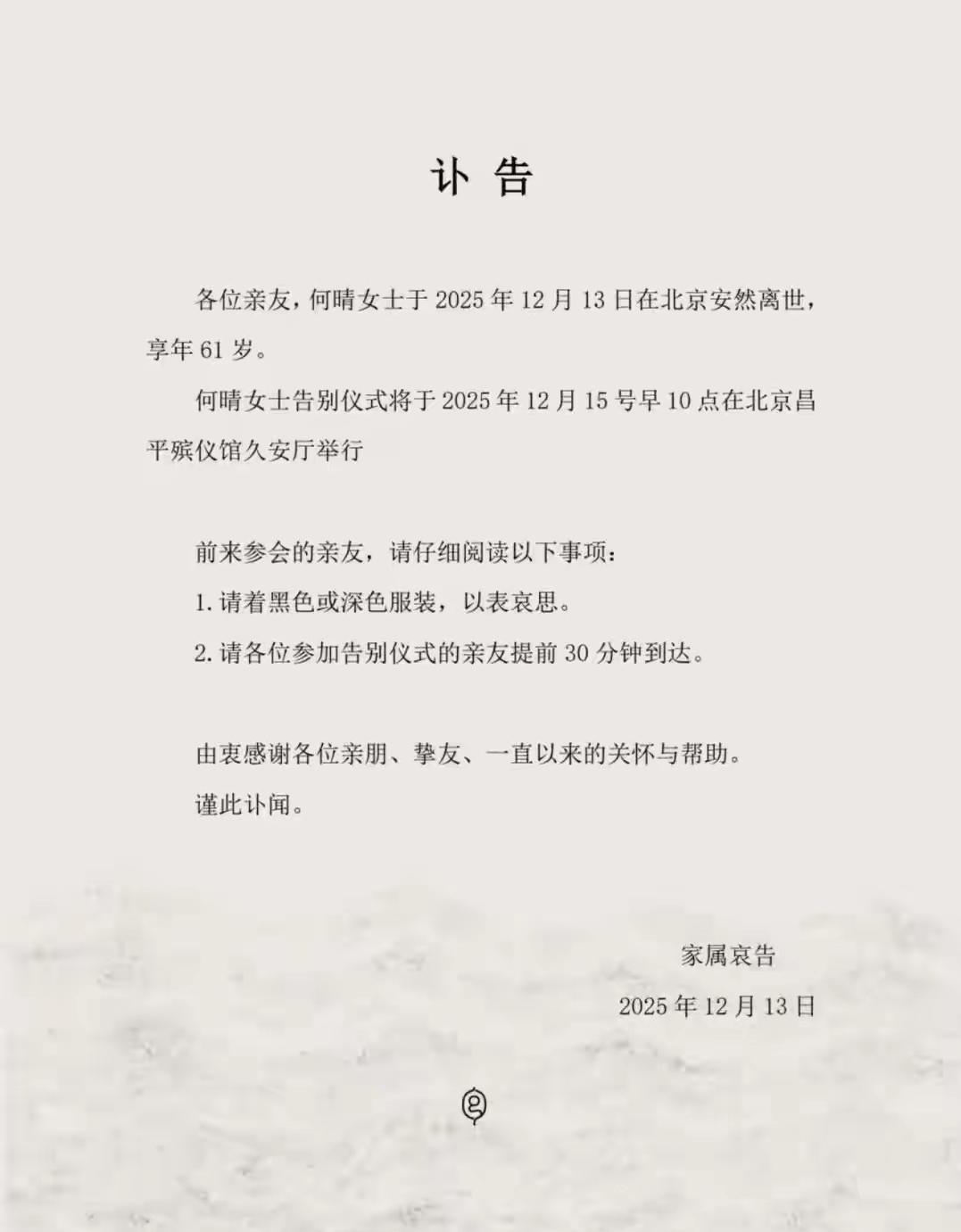 演员何晴于2025年12月13日因病在北京逝世,享年61岁。家属讣告显示,她此前已罹患脑瘤多年,近年病情恶化。 女演员何晴堪称四大名著“专业户”,她在四大名著影视剧中饰演了多个经典角色。在《西游记》里,她演了怜怜,也就是灵吉菩萨化身的三仙姑,当时杨洁导演和六小龄童在火车上遇到她,六小龄童推荐后,杨导看她水灵大眼睛就敲定了。《三国演义》中,她是小乔,展现出了小乔的温婉与美丽。《红楼梦》里,她扮演秦可卿,把秦可卿的风流袅娜演绎得淋漓尽致。《水浒传》中,她又成了李师师,将李师师的风情万种诠释得恰到好处。何晴凭借自身颜值与演技,把这些角色都演活了。 何赛飞古装