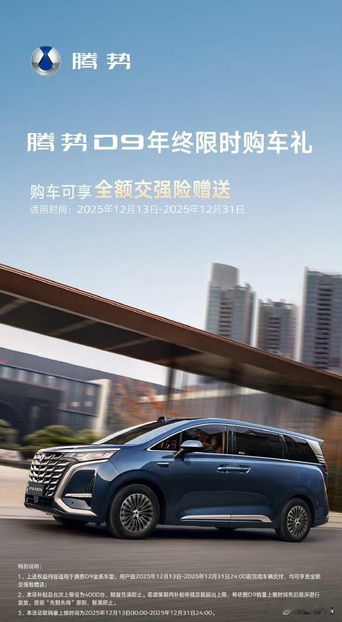 腾势D9已经达到了30万台的销量,李慧总也是带来了一波年终福利:购车就送全额交强险 这次很明确了,作为全球的MPV冠军,这一次就是要把用户服务好,把能给的都给到位,最后再冲一冲年终销量 这才是正确的方向,不搞噱头,不讲概念,拿出实际行动回馈用户信任,坚持长期主义