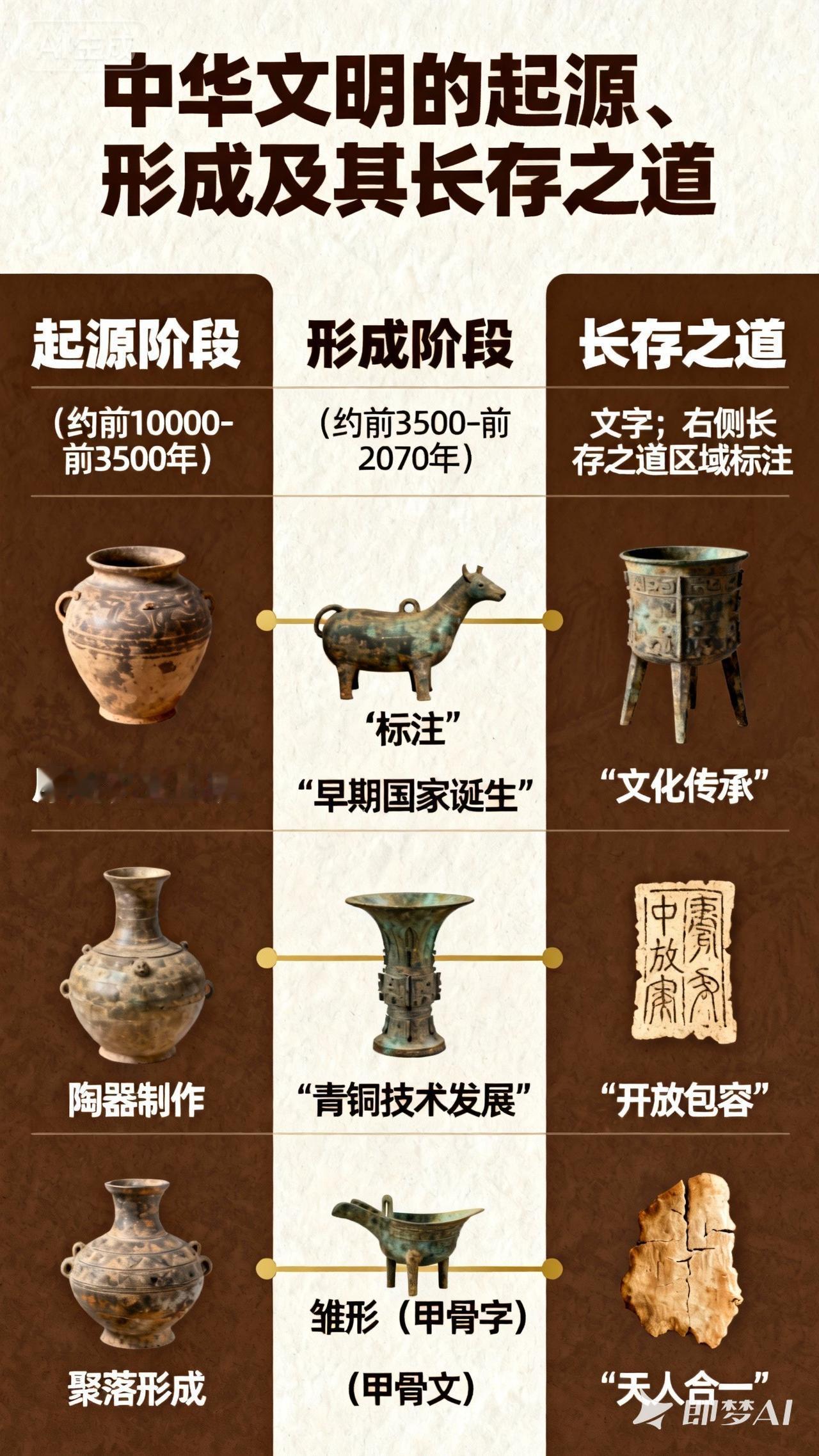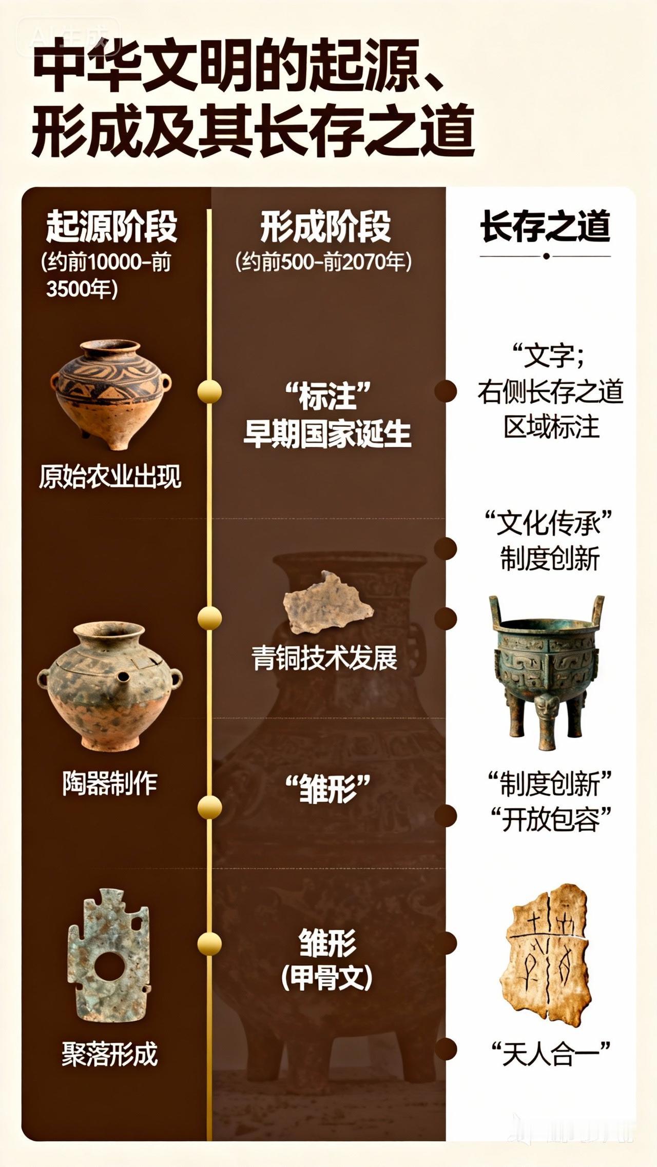 奔流八千年:解锁中华文明从未断流的密码 在世界文明长河中,中华文明是独一份的奇迹——它跨越数千年风雨,始终奔流不息,从未断绝。 中国人对文明源头的追溯,自古就藏在“三皇五帝”的传说里。女娲抟土造人、伏羲观象画卦、神农教民稼穑、黄帝一统华夏,这些口耳相传的故事,勾勒出中华文明根植中华大地的最初轮廓。然而近代以来,“中国文化西来说”的杜撰、疑古思潮的冲击,让传统古史体系摇摇欲坠,“东周以上无史”的极端论调一度甚嚣尘上。关键时刻,现代考古学挺身而出,扛起了实证古史的重任。 百年来,安阳殷墟的甲骨、二里头的宫殿基址、良渚的古城水坝、石峁的石砌城墙……一个个沉睡千年的遗址被唤醒,一页页“无字天书”被破译。商史从传说变成信史,夏史逐渐得到印证,“五帝时代”也有了考古线索支撑。中华文明的开端,从商代晚期的3700年,一步步追溯到8000年前的文明萌芽,质疑声被铁一般的实证击碎。 其实,关于文明年限的争议,源于对“文明”概念的不同理解。周代文献里的“文明”,指向道德修养与礼仪制度的高度;如今我们所说的“文明”,更多对应西方“Civilization”的意译,指代脱离野蛮的高级社会阶段。而厘清争议的关键,是分清“文明起源”与“文明形成”——前者是漫长的孕育过程,后者则以早期国家的出现为标志。 8000年前,南稻北粟的农业体系落地生根,贾湖遗址的骨器“规矩”、高庙遗址的八角星纹,见证着先民“观象授时”的智慧和“天圆地方”的宇宙观,“早期中国文化圈”雏形初现,这是文明起源的第一步。 6000年前,仰韶文化庙底沟类型强势崛起,带动多地文化交融,大型聚落、精美玉器纷纷涌现,社会加速复杂化,文明起源迈出第二步。 5100年前,良渚古城的巍峨城墙、南佐遗址的宏大宫殿,标志着早期国家诞生,中华文明正式形成。4100年前,夏王朝建立,中华文明迈入成熟的“王国文明”阶段。 而中华文明长存的密码,就藏在“一元”宇宙观和“多元一体”格局里。敬天法祖的信仰、内敛和合的文化基因,让这片土地上的文明,分裂时向往统一,统一时守护统一。这,就是中华文明跨越千年依旧生机勃勃的根本之道。