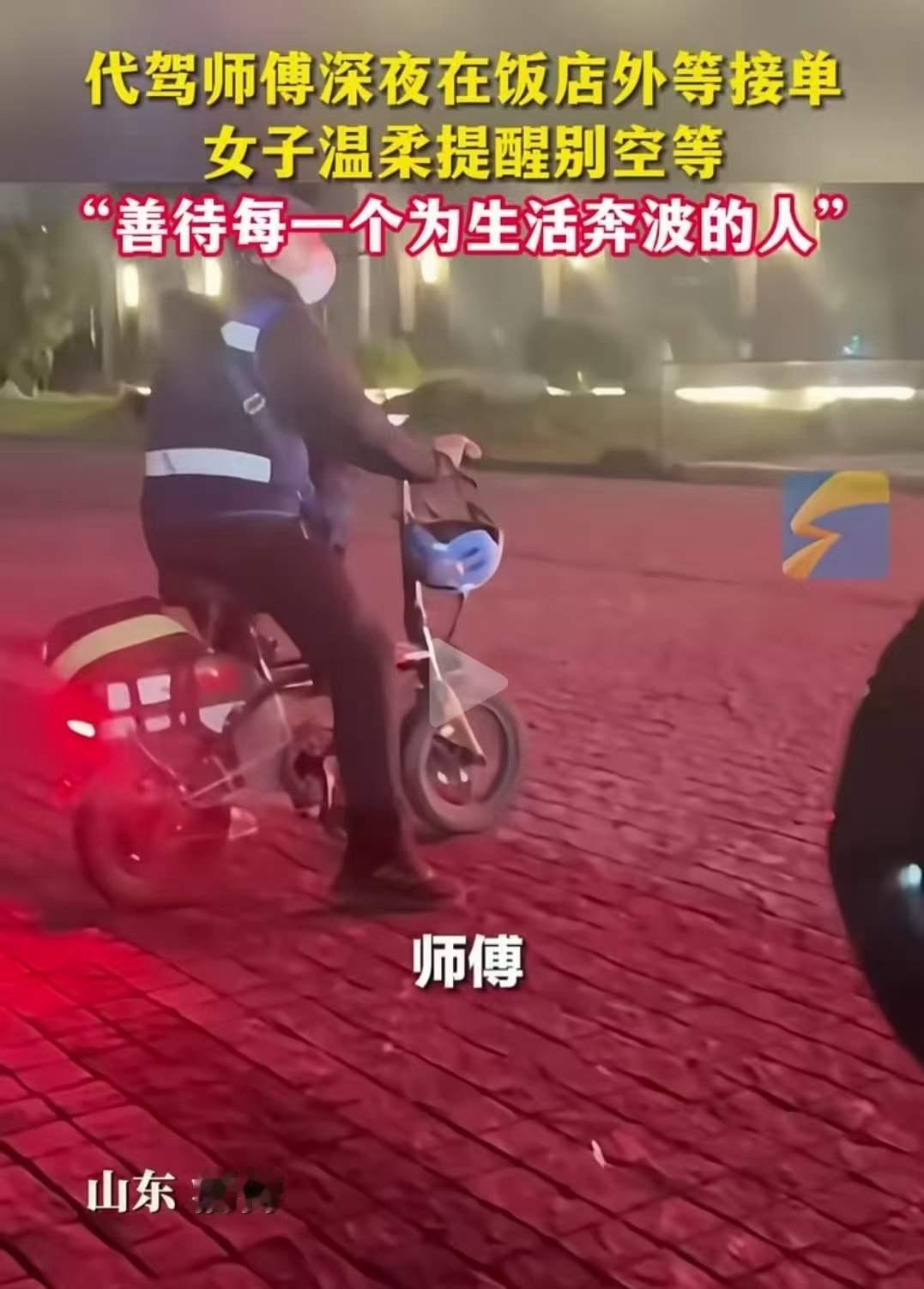 淄博深夜的暖心一幕:代驾师傅与女子的温情对话感动全网 近日,山东淄博街头一则看似平常却充满温情的视频在网络上迅速传播,引发无数网友点赞。视频中,一位代驾师傅深夜守候在饭店门口等待接单,一位刚结束聚餐的女子却主动上前劝其离开,而接下来的对话,让寒夜中的这一幕充满了人性的温暖。 当晚10时许,淄博张店区某饭店外,代驾师傅李师傅像往常一样,裹紧外套靠在电动车旁,目光不时扫向旋转门——这是他今晚的"战场",也是无数同行共同的守候。突然,一位穿着米色风衣的女子快步走来,轻声说道:"师傅,您别在这儿等了。"李师傅愣住了,下意识攥紧了车把,心中泛起疑惑:难道自己挡了路?或是饭店有规定不允许代驾停留? 正当他准备解释时,女子突然从包里掏出一把折叠椅:"您看,门口风大,您搬到对面台阶上等吧,那儿有灯还避风。"说着,她将椅子展开放在路边,又从保温杯里倒出一杯热水递过来,"我观察您好一会儿了,这么冷的天,您穿得也不厚实,别冻坏了。" 这突如其来的关怀让李师傅眼眶发热。他接过热水,发现杯壁上还贴着"暖心驿站"的标签——原来女子是附近社区的志愿者,刚结束公益活动来吃饭,看到代驾师傅们在寒风中瑟缩,便自费购买了折叠椅和热水壶,想为这些城市夜行者提供些便利。 这段视频被路人拍下上传网络后,迅速引发共鸣。网友"春风十里"评论:"一杯热水,一把椅子,折射出的是对普通劳动者的尊重与关怀。"更有本地网友表示:"淄博的温暖从来不是口号,它藏在烧烤摊的烟火气里,也藏在陌生人递来的热水中。" 面对赞誉,女子在接受采访时谦逊回应:"只是举手之劳,代驾师傅们为城市夜生活保驾护航,他们更值得被温柔以待。"而李师傅则将那把折叠椅留在了原地:"以后这里就是我们的'暖心据点',让这份温暖传递下去。" 在这个快节奏的时代,一个细微的善举,足以驱散寒夜,照亮人心。淄博街头的这一幕,恰似一束微光,提醒着我们:真正的城市温度,不在于高楼大厦的林立,而在于每个普通人心中那份对他人的体恤与关怀。山东淄博 代驾哥