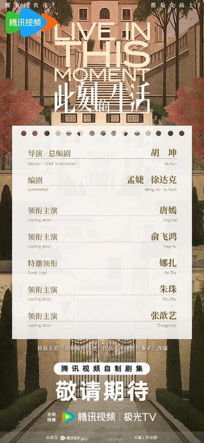 新丽《此刻的生活》招商主演:唐嫣、俞飞鸿、娜扎、朱珠、张歆艺播出平台:腾讯视频+