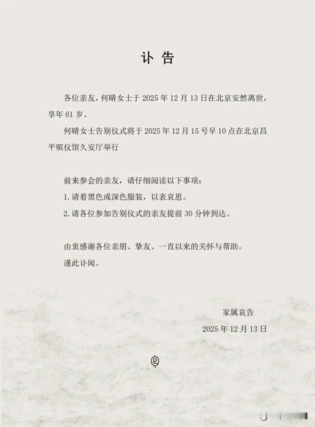【知名女演员何晴去世,终年61岁,曾演遍四大名著】 据扬子晚报消息,12月13日,一份家属发布讣告显示,著名演员何晴在北京安然离世,享年61岁。告别仪式将于2025年12月15号早10点在北京昌平殡仪馆久安厅举行。 “电影守望者余泳”向记者证实了这一消息,他于社交平台发布何晴的黑白肖像照,并配文“天堂没有病痛,何晴,大美女,一路走好”,引发网友与演艺圈人士的集体缅怀。余泳透露,何晴生病后一直希望低调,让大家永远记住她美好的形象。 公开资料显示,何晴1964年1月13日出生于中国浙江省衢州市江山市,毕业于浙江昆剧团,被媒体誉为“古典第一美女”。 何晴曾在《西游记》中饰演灵吉菩萨;在《红楼梦》中饰演秦可卿;在《三国演义》中饰演小乔;在《水浒传》中饰演李师师。她演遍了四大名著,也被誉为“古典第一美女”。此外,何晴的代表作还有《青青河边草》《上海舞女》等。