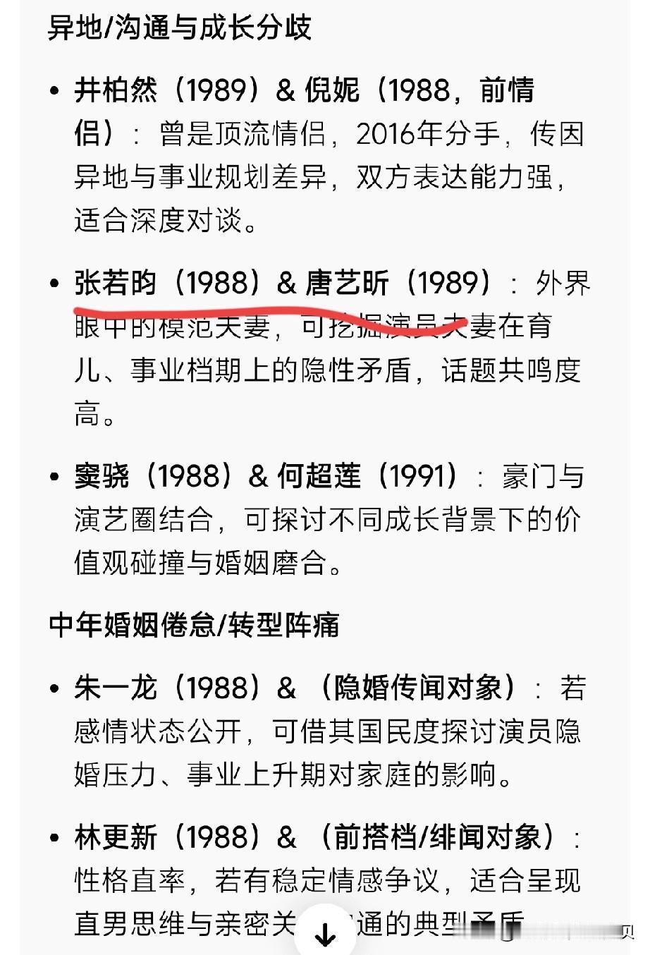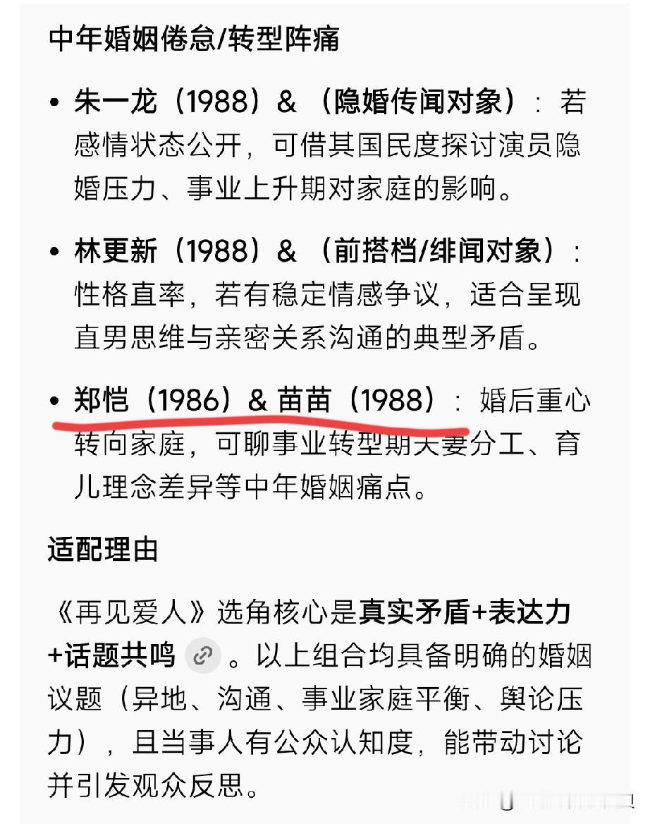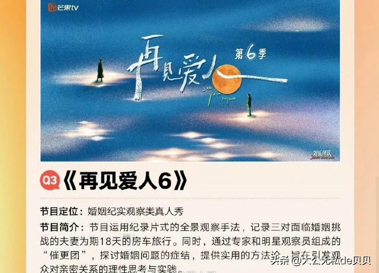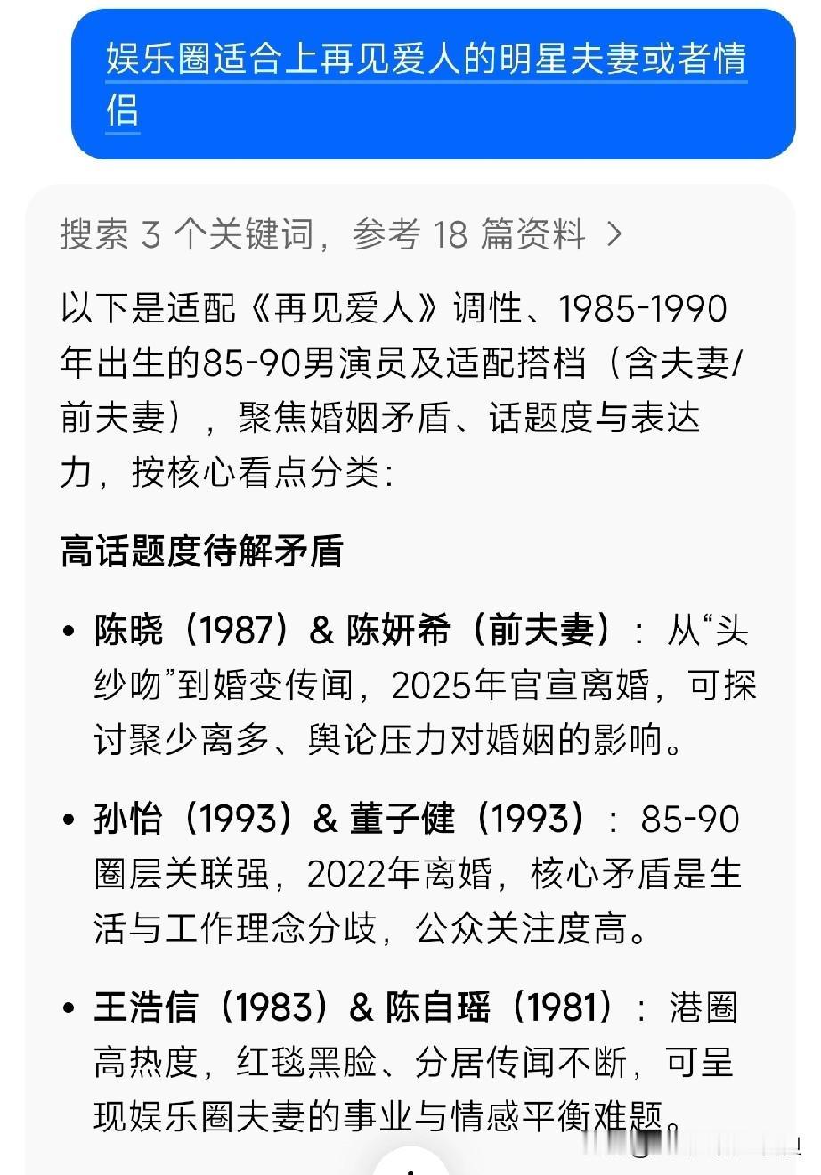 芒果台还是血厚啊! 这一季的再见爱人扑得挺惨烈的了,还以为这个IP会就此偃旗息鼓呢! 没想到下一季已经开始录制⏺了。 我很好奇,内娱现在还能找到三对,🈶婚姻危机的明星夫妻吗? 问了豆包,给出的答案让人哭笑不得! 要么是已经官宣离了的,比如陈晓陈妍希,董子健孙怡 要么是「八百年前就已分手」的,井柏然倪妮 要么是婚姻非常甜蜜的,比如唐艺昕张若昀,郑恺苗苗 就王浩信YOYO合适,但是也凑不够啊!估计又要找18线凑数了。