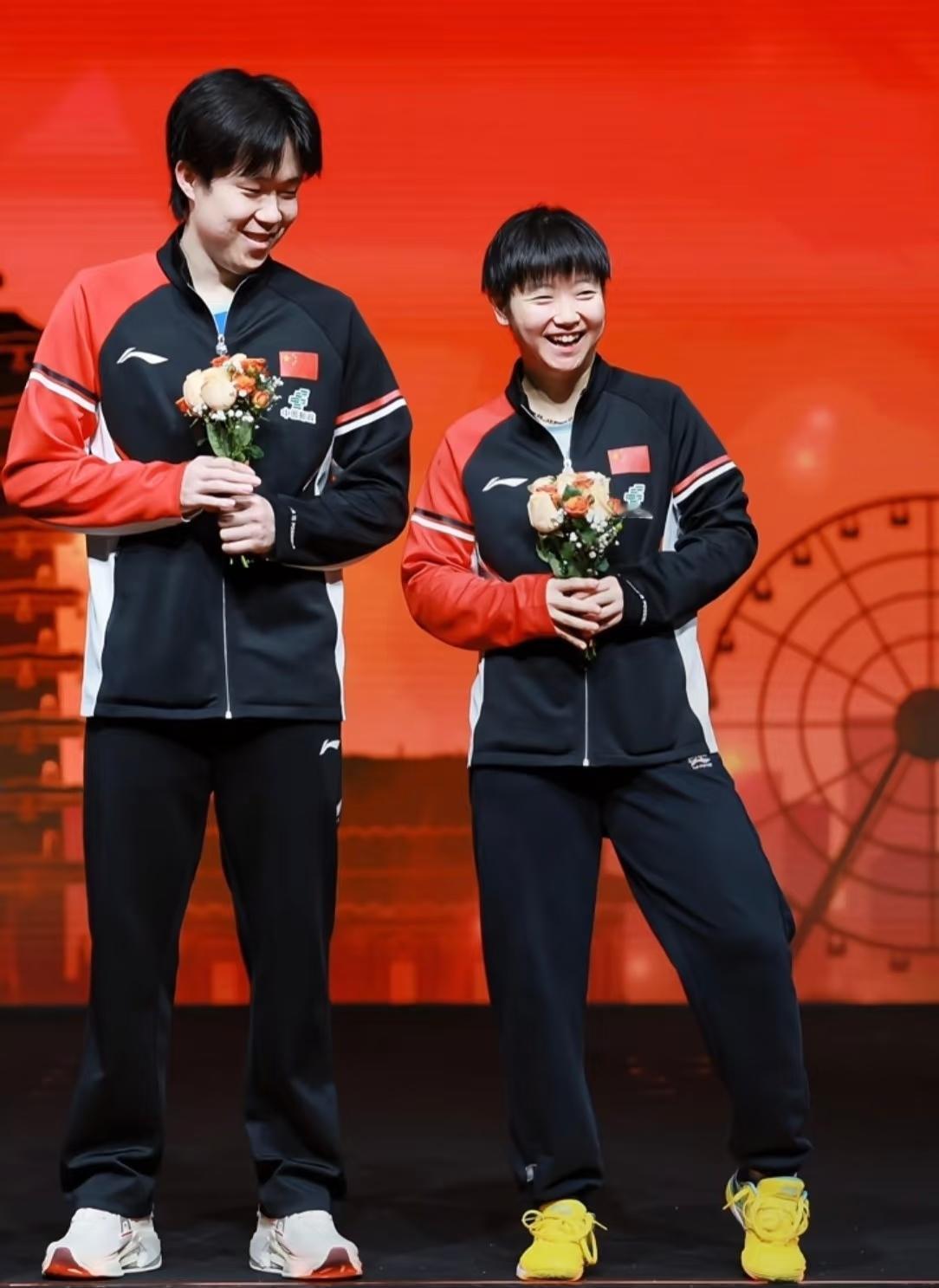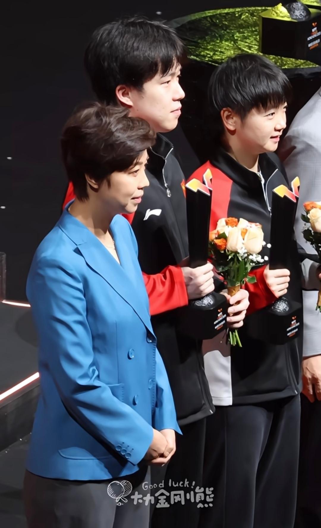 莎莎看到张怡宁都忘记伤痛了。 混双莎头拿的亚军,没想到颁奖嘉宾是张怡宁。莎莎的偶像。看到偶像,莎莎嘴就没合拢过。 颁奖后合影莎莎就跟着张怡宁的方向一边走一边聊,要不是大头叫住都要跟着张怡宁下台了。 莎莎是真喜欢张怡宁呀!