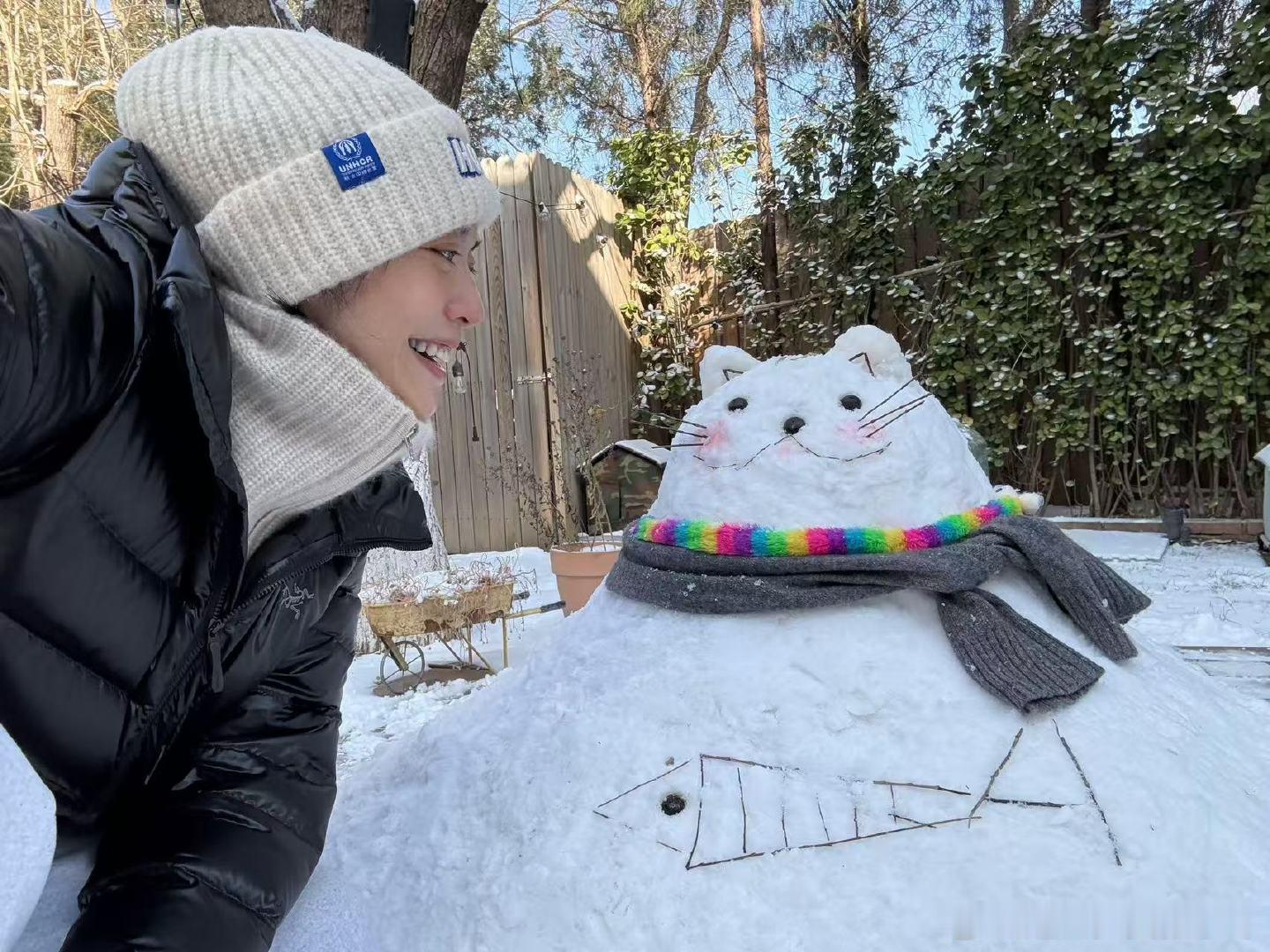 姚晨和儿子在家院子堆雪人 姚晨和儿子在家院子堆雪人,雪猫嘴角上扬,好可爱姚晨和12岁儿子堆雪人