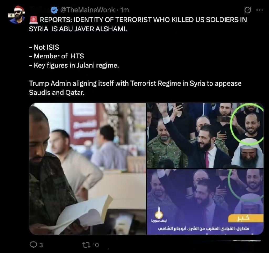 昨天的两起美国人被枪击案,虽然死伤都不多,但却都有独特的看点。 在叙利亚的美军被袭击三死三伤,只看伤亡的话不算啥大事。但看点在于,袭击者是叙利亚朱拉尼政府工作人员。 朱拉尼政府发言人辟谣说,这个人从来没有担任过领导职务。看这谣辟的:不是领导,这不就是承认是政府内部人员了? 还记得吗?前段时间,联合国把朱拉尼移出恐怖分子名单的议案,可是美国提案的哦! 布朗大学枪击案两死八重伤,对于美国来说也不算太大的事。但仍然有一个不同寻常的特点:警方说到现在还没找到枪手的丝毫信息,查遍了布朗大学的八百多个监控摄像头在枪击案前后的视频,没发现任何疑似枪手的监控内容。