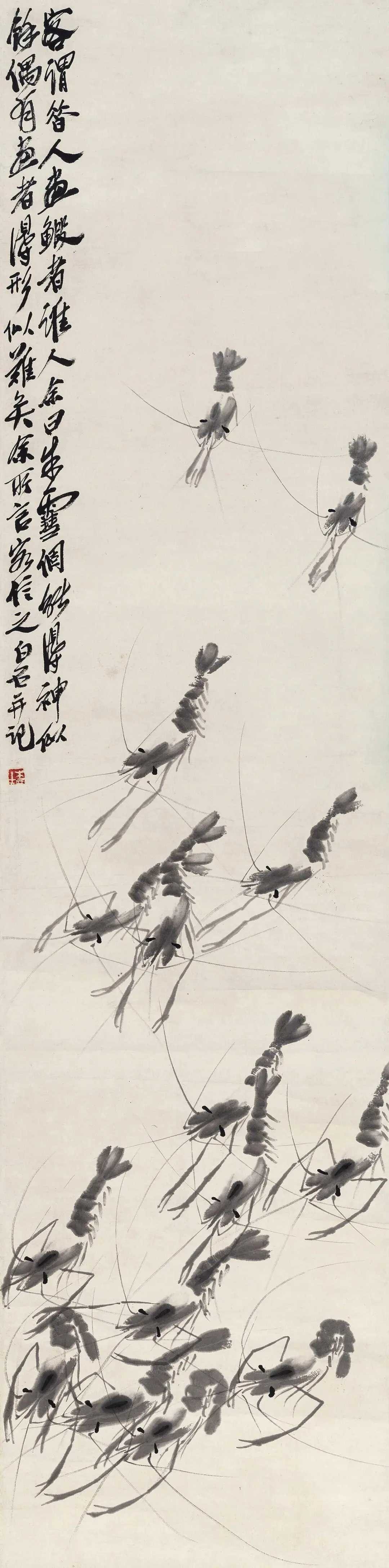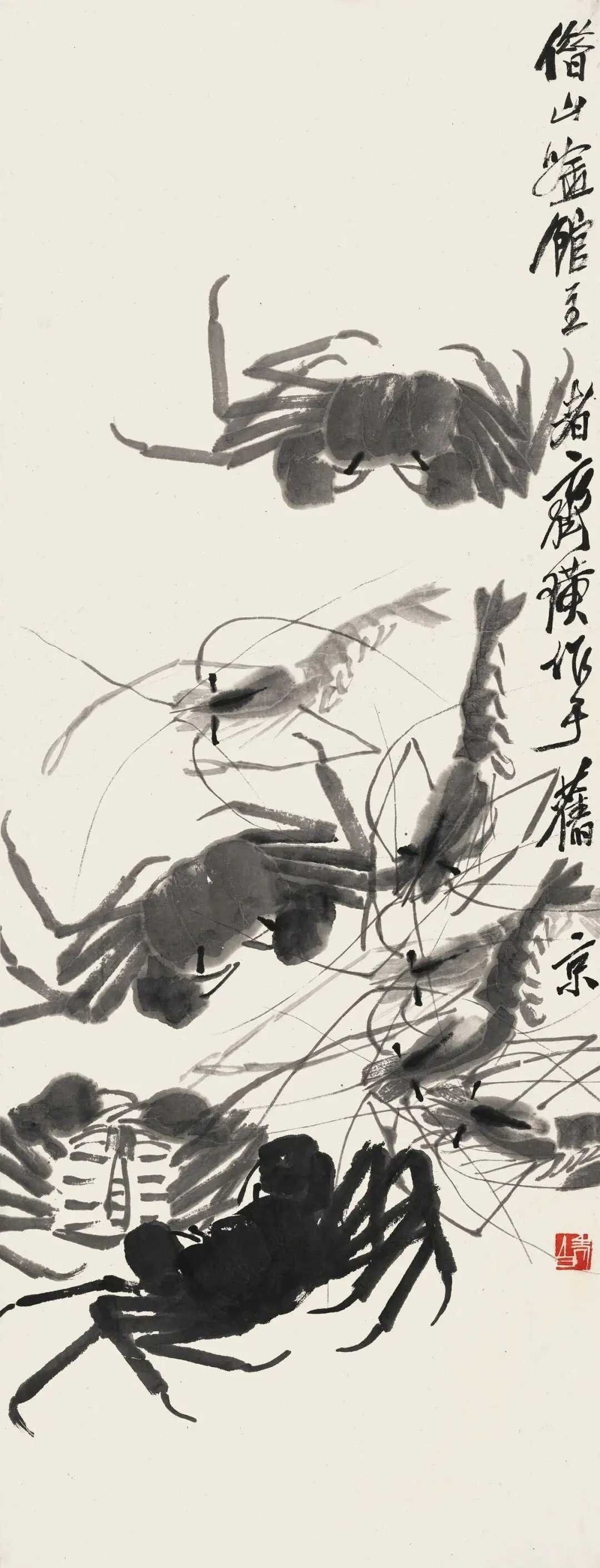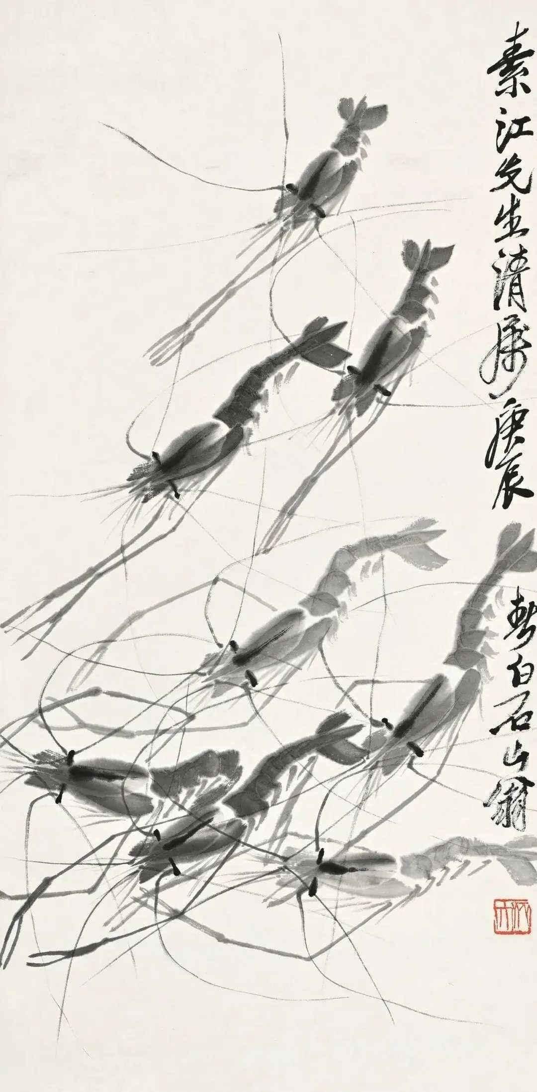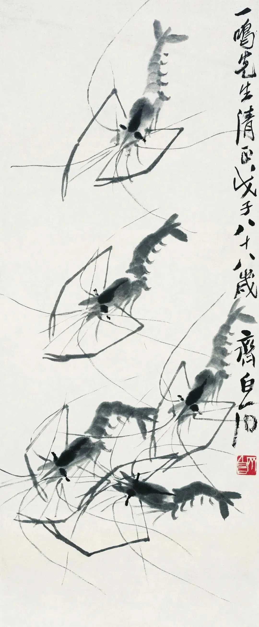 齐白石画虾。齐白石笔下的绘画曾有“三绝”之誉,即画虾、画蟹、画鸡,其中又以画虾最富盛名。盛名之下,是白石老人长久以来无论是对古人的学习、或是对自然的观察,厚积薄发的结果。这就是中国风遇见艺术
