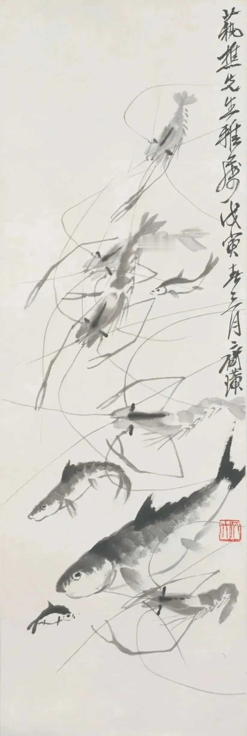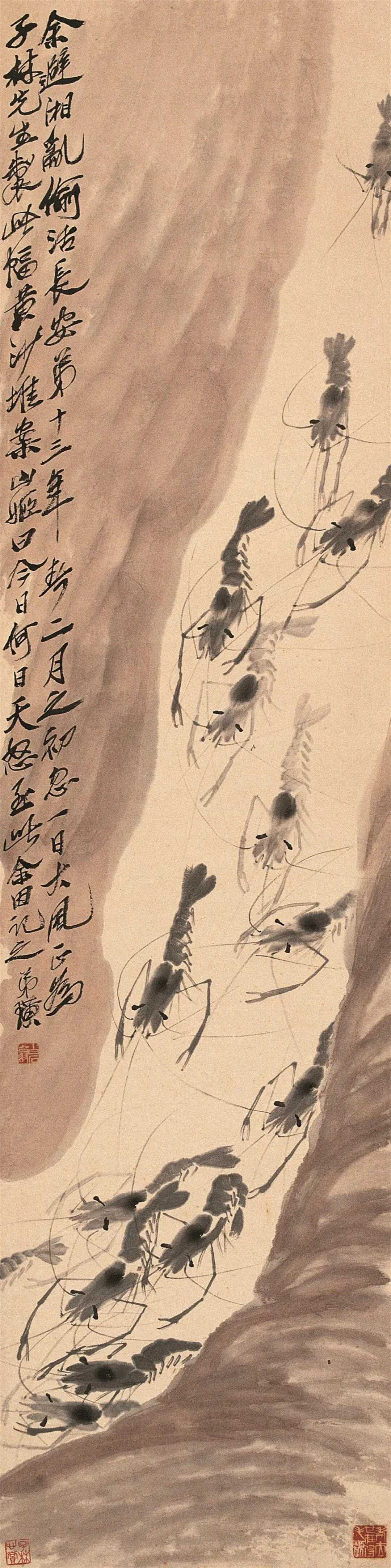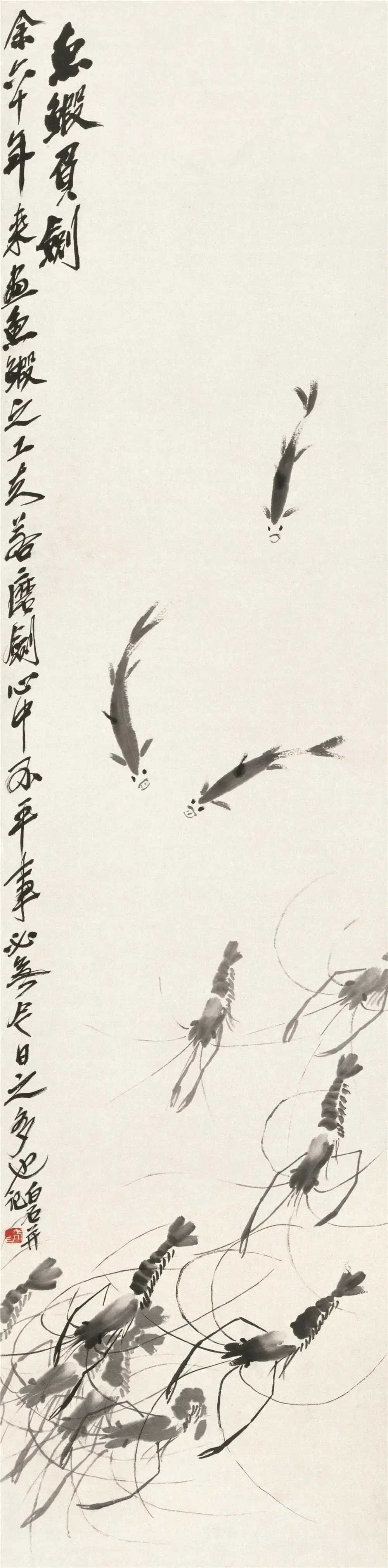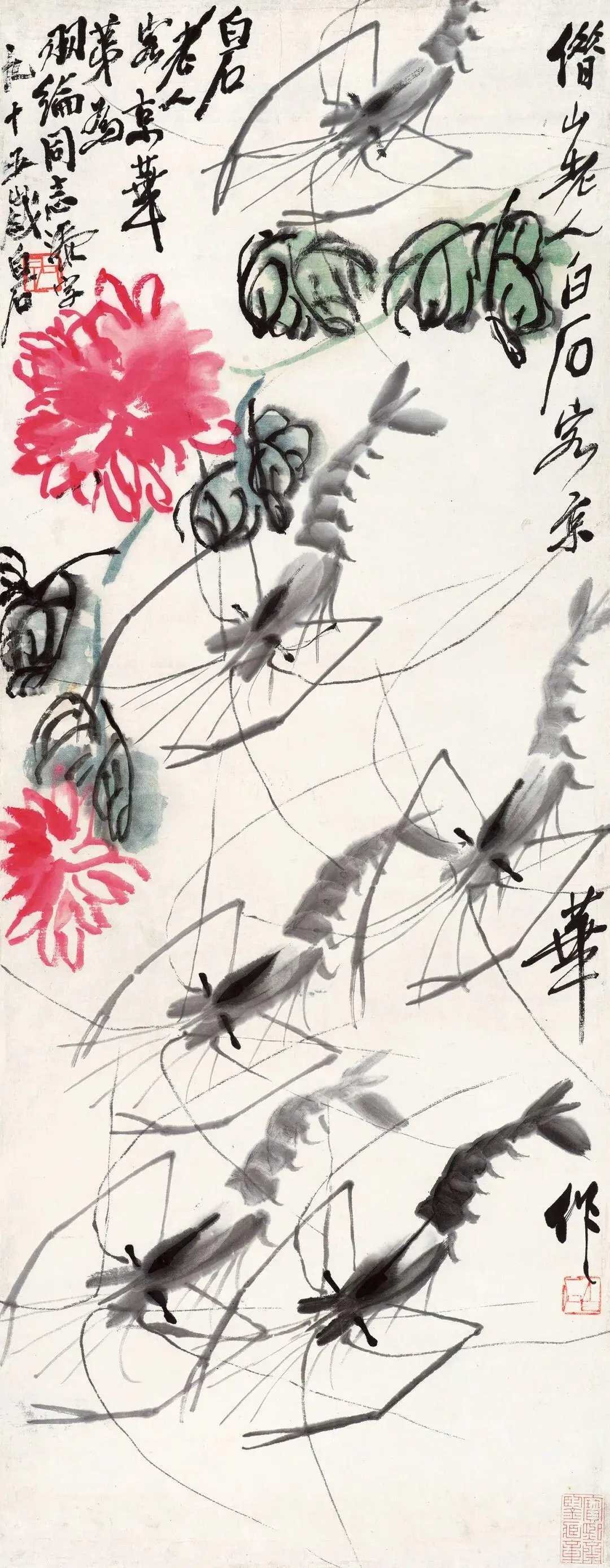 齐白石画虾。齐白石笔下的绘画曾有“三绝”之誉,即画虾、画蟹、画鸡,其中又以画虾最富盛名。盛名之下,是白石老人长久以来无论是对古人的学习、或是对自然的观察,厚积薄发的结果。这就是中国风遇见艺术