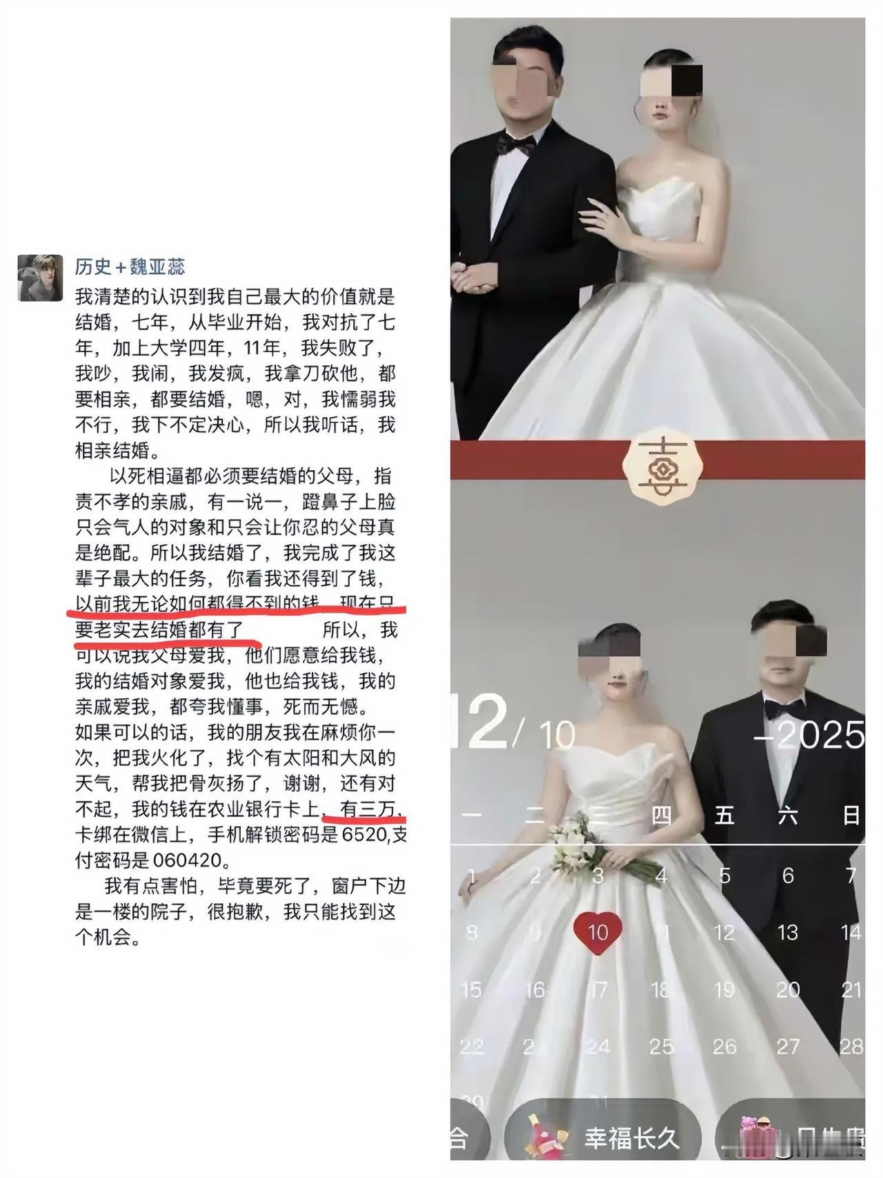 女儿就是摇钱树 看了28岁女教师发的朋友圈,最让我印象深刻的一句话,那就是她说以前无论如何都得不到钱,现在结婚了就有钱了 一个高中教师工作了七年,存款只有三万,可想而知这些年父母向她索取了多少 从始至终都在逼她嫁人了,因为这样就有彩礼钱了 不喜欢还要结婚,拍婚纱照,如今女教师是解脱了,男方可就难受了,结婚当天新娘跳楼没了,这以后男方在当地估计是很难娶到老婆了