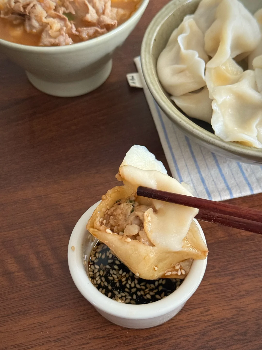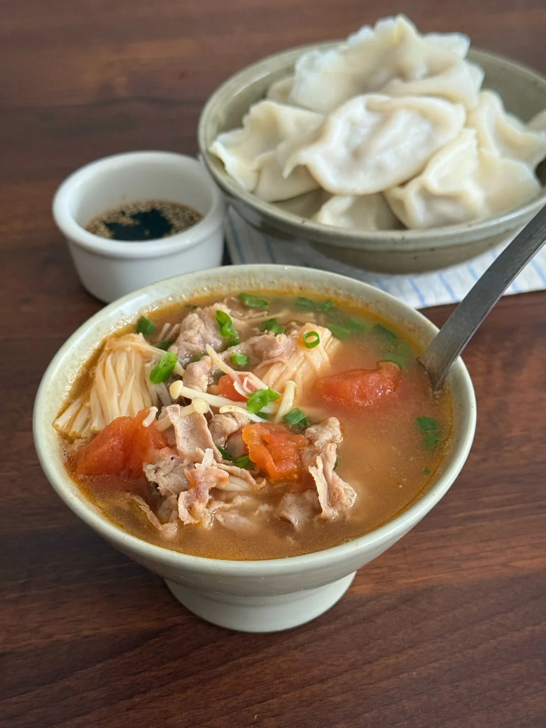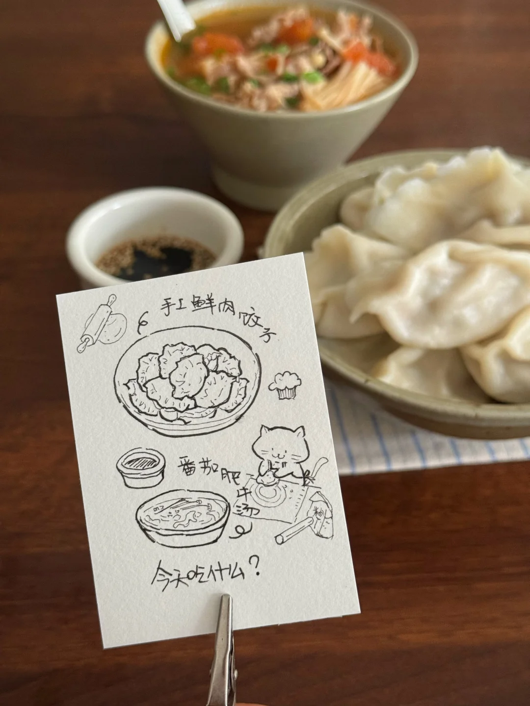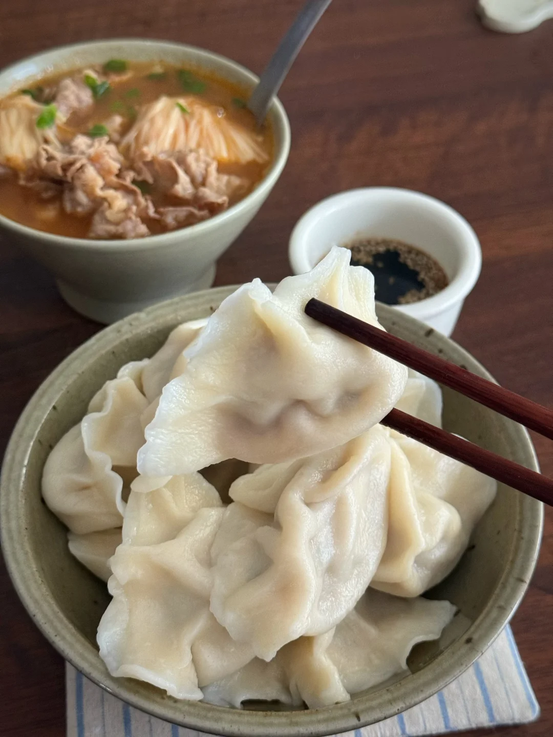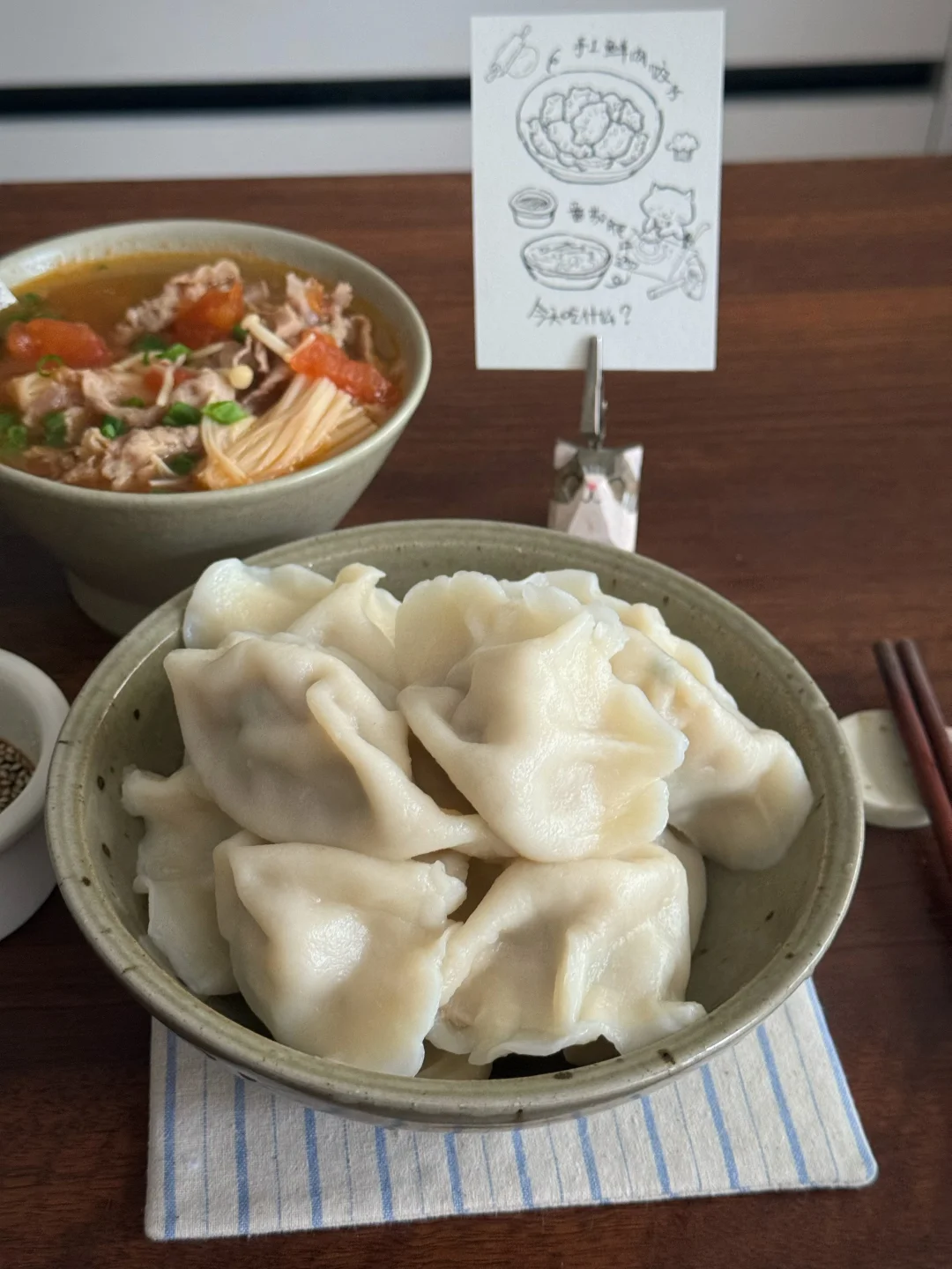 今日午餐:手工鲜肉水饺+临时起意的番茄肥牛汤。 🥟自己做饺子,最让人满足的往往是那筋道有韧性的饺子皮;馅料则随喜好调配就好——我就简单调了肉末加小葱,却也鲜美。 手工捏出的饺子,总透着股幸福的温度;而那碗即兴煮成的汤,是随兴所至的快乐。 一顿饭,两种满足。