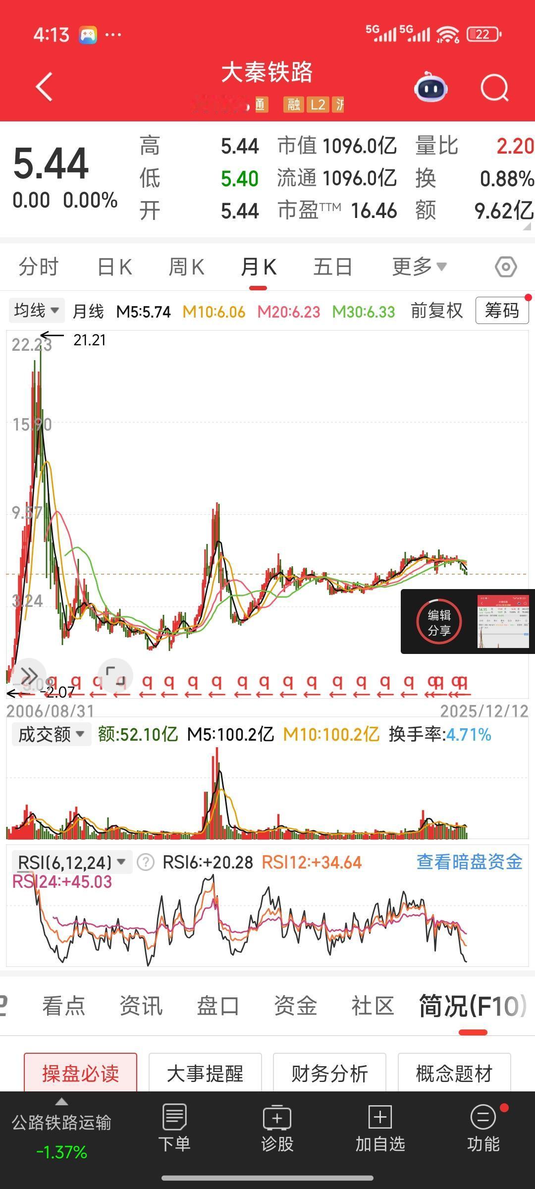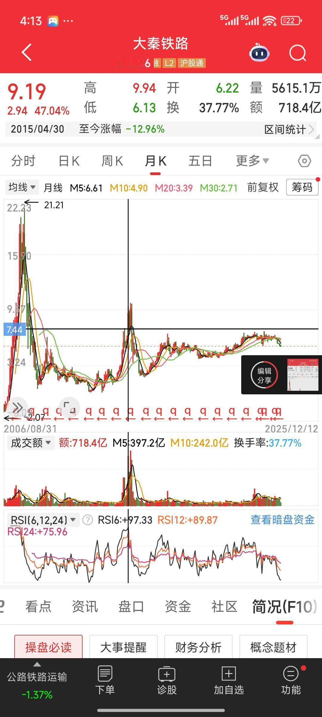 大秦铁路,作为高股息股票的代表之一,业绩稳定,是一只优质股。在前两轮大牛市中,除了稳定的股息回报,股价在两次牛市里均大幅上涨。无论是2007年的牛市,还是2015年的牛市,它都未曾缺席。 然而,此次情况截然不同。从2015年至今近10年,尤其是2024年9月牛市启动以来,科技股表现亮眼,众多股票涨幅翻倍甚至两倍。但这类高股息股却毫无动静,甚至逐步下跌,形成了极为鲜明的局部牛市特征。 这次牛市可谓前所未有、与众不同,与以往的牛市大不相同。我们必须摒弃以往的炒股思维,不要认为自己的股票最终总会迎来上涨。或许应该拥抱科技,普涨的大牛市可能已经一去不返。只有投身头部股票和科技股,才有可能在牛市中获得较好的收益。高股息分红 高股息股 高股息核心龙头 高股息高分红 大秦股份 煤炭股息率 股票面股息率