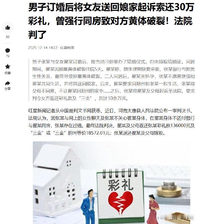 河南太康,一对男女办了婚礼却没领结婚证便开始同居,女子生理期将至,男子强行和她发生夫妻之事时致其黄体破裂,花1万多治好后,男子见女子没有怀孕,就把她送回了娘家,女子想回去,男子以父母不同意拒绝。不久后,男子竟将女子告上法庭,索要30余万元彩礼和三金,女子称男子曾承诺出轨就把房子和彩礼给她,最终法院这样判! (信息来源:红星新闻) 张某与翟女士,于2024年4月29日订婚,当时张某给了翟女士20万彩礼,还有2000元的金猪。 到了2025年1月,两人去看小件东西,张某又给了2万彩礼,还有4000元的端茶钱,另外还买了价值18500余元的三金。 1月25日,两人办了婚礼,张某又给了2万上下车礼。 婚礼办完后,两人就同居了,刚开始那段时间,翟女士偶然间发现张某在网上和其他女人聊天,心里很不是滋味,就质问张某。 张某为了哄翟女士,保证自己要是出轨,就把房子和彩礼都给翟女士,还签了协议。 翟女士虽然心里还是有些疙瘩,但看张某态度诚恳,也就暂时原谅了他。 可2025年6月14日这天,翟女士生理期到了,身体很不舒服,整个人都没什么力气,张某却不顾翟女士的反对,强行要和翟女士发生了夫妻之事。 翟女士拼命反抗,可根本拗不过张某,经这一折腾,翟女士黄体破裂,疼得在地上直打滚,张某这才慌了神,赶紧把翟女士送去救治。 加上各种救治费用,共花了12509元。 这期间,张某虽然人一直陪着翟女士,但态度却越来越冷淡,翟女士躺在床上,身体疼,心里更疼,她怎么也没想到,曾经那个对自己甜言蜜语的男人,会变成这样。 事后,翟女士身体还很虚弱,需要人照顾,可张某的态度却来了个一百八十度大转弯,对翟女士不闻不问。 6月30日,张某竟然直接把翟女士送回了娘家,还扔下一句话,说自己父母不同意他们继续在一起了。 翟女士想回去找张某问个清楚,可张某却始终不同意,还把门锁都换了。 翟女士觉得自己为这段感情付出了这么多,最后却落得这样的下场,她怎么也不明白,曾经那么相爱的两个人,怎么说变就变了。 就在翟女士还在伤心难过的时候,张某竟然一纸诉状把她起诉了,要求她返还30余万元彩礼和三金。 翟女士接到传票时,觉得自己才是这段感情的受害者,张某不仅在她生理期强行和她发生夫妻之事,导致她受伤,现在还要把彩礼要回去,这还有没有天理了。 翟女士想起张某曾经承诺如果自己出轨,就把房子和彩礼给她,现在张某不仅没有兑现承诺,还反过来告她,她决定一定要为自己讨个说法。 按照法律,彩礼可能还真得返还一部分,彩礼到底该不该返还呢? 从法律层面来讲,根据《民法典》婚姻家庭编的解释规定,当事人请求返还按照习俗给付的彩礼的,如果查明属于以下情形,应当予以支持,其中就包括双方未办理结婚登记手续这一条。 张某和翟女士虽然办了婚礼,但并没有领取结婚证,从法律意义上来说,他们并不是合法夫妻。 所以,张某要求返还彩礼,从法律条文上看,是有一定依据的。 但是,法院在判决的时候,并不会仅仅依据这一条就简单判决,还会综合考虑各种因素,比如双方共同生活的时间长短、有没有生育子女、彩礼的实际使用情况以及双方的经济状况等。 张某在和翟女士同居期间,存在过错行为,导致翟女士黄体破裂,花费了12509元的救治费用,还有翟女士的手机也在冲突中损坏,价值6099元。这些费用都应该从彩礼中扣除。 翟女士及其父母为这场婚礼也置办了不少嫁妆,这些嫁妆是翟女士及其父母的个人财产,张某也应该返还。 现在很多年轻人,觉得办了婚礼就是夫妻了,对领结婚证这件事不重视,可实际上,结婚证不仅仅是一张纸,它是法律对夫妻关系的认可和保护。 没有结婚证,在法律上就不算合法夫妻,一旦发生纠纷,在财产分割、权益保护等方面都会面临很多麻烦。 最终法院酌情判决翟女士返还136000元彩礼及三金,张某返还翟女士及其父母置办的全部嫁妆。 翟女士能不能以张某出轨为由,拒绝返还彩礼呢? 虽然张某曾经承诺出轨就把房子和彩礼给翟女士,但这种承诺并没有法律效力。 而且,返还彩礼的依据是双方未办理结婚登记手续,而不是一方是否出轨。 所以,翟女士不能以此为由拒绝返还彩礼,法院在判决时会考虑张某的过错行为,适当减少返还的数额。 在感情中,双方一定要相互尊重、真诚相待,像张某这样,在感情中不忠诚,还对女方造成身体伤害,这种行为不仅违背了道德,也触犯了法律。 而女方在面对感情问题时,也要学会保护自己,不要一味地忍让和妥协。
